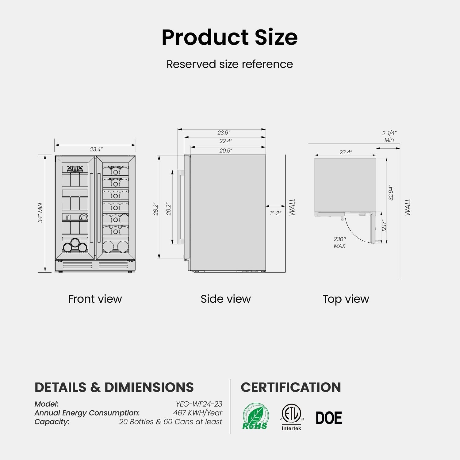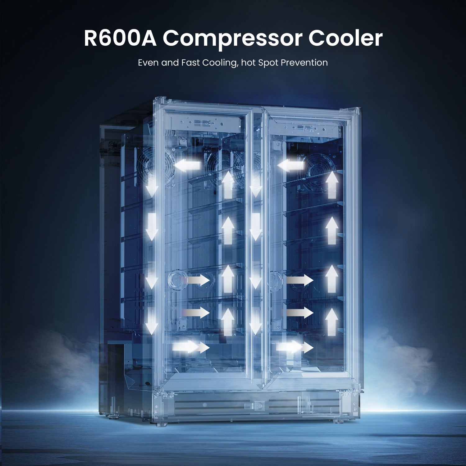 Eco-Friendly and Efficient Cooling: Featuring R600a refrigerant and DOE certification, the Yeego Wine Beverage Cooler offers fast, even cooling while saving energy. The front-venting fan system enhances air circulation and heat dissipation, while the activated carbon filter removes odors, maintaining a fresh environment inside this wine beverage refrigerator.