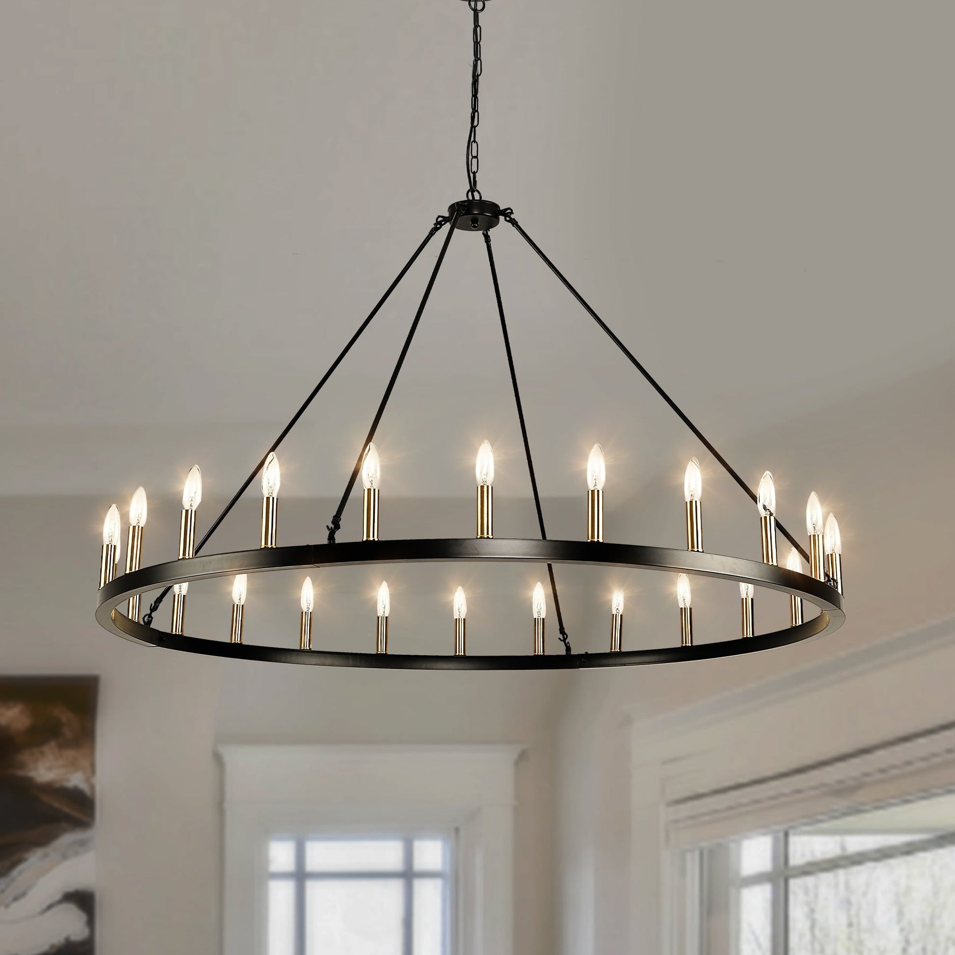 Add a touch of modern farmhouse style to your home 54-inch Round Wagon Wheel 24-light Chandelier. Made of sturdy metal and available in multiple finishes, this chandelier boasts a charming wagon wheel design that is sure to impress. With 24 bulbs and an ample size, this fixture provides plenty of light for larger rooms and is perfect for creating a cozy atmosphere in any space.