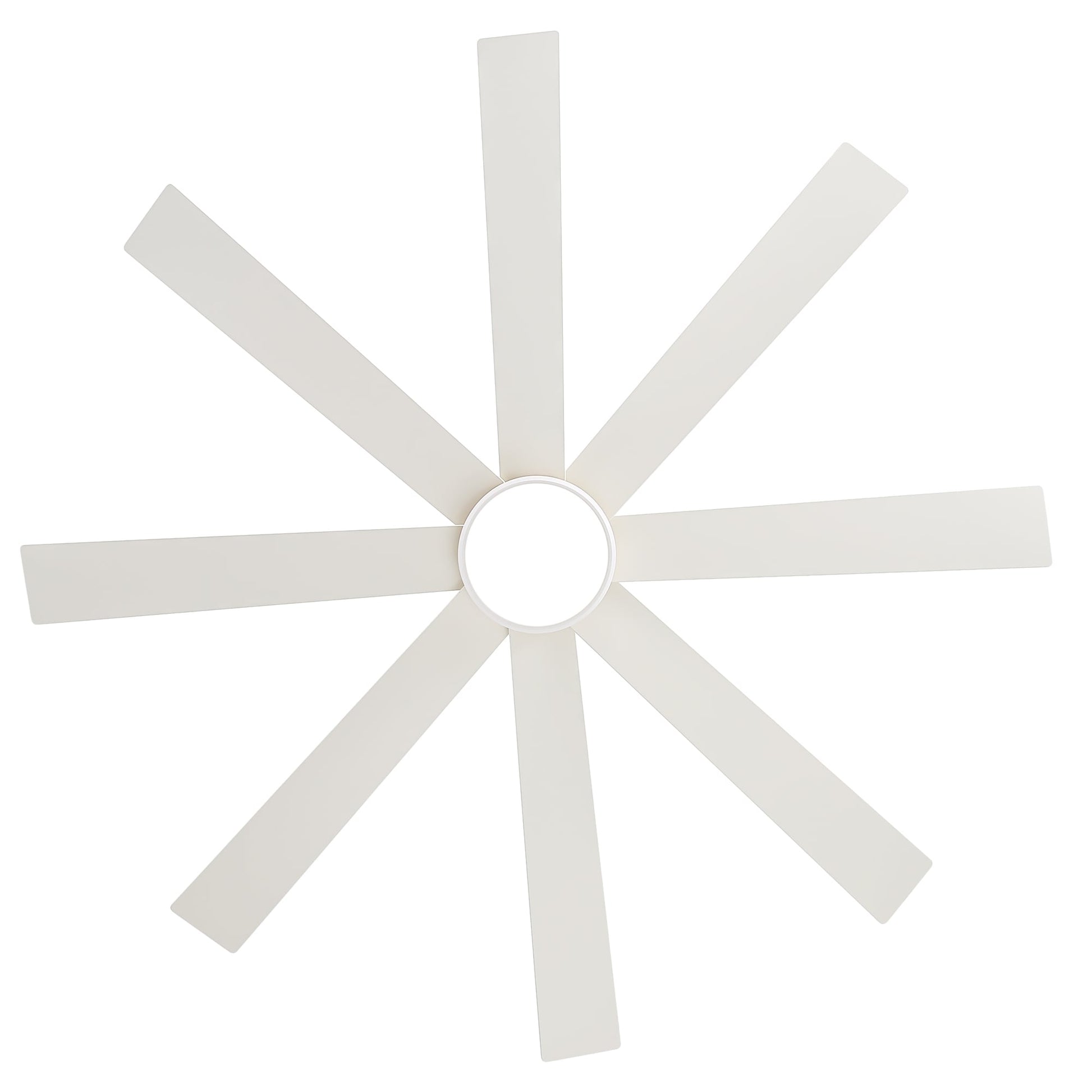 A modern design that performs well in indoor environments,  generates a substantial amount of airflow. It is a very big fan with 8  blades and 65 in. blade span. This dry rated and ceiling fan housing is  constructed with the durable Plywood blade and metal material. 8  handsome blades are available in white finish featuring reversible and  removable. It features a powerful DC motor that runs smoothly and  quietly while operating 70% more efficiently than AC motors. The  convenient, 6-speed set-up can be controlled locally using the included  remote control.