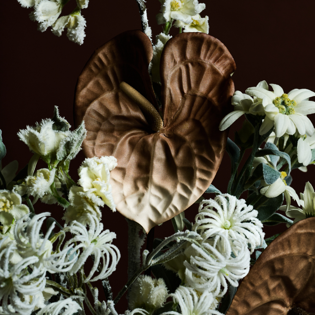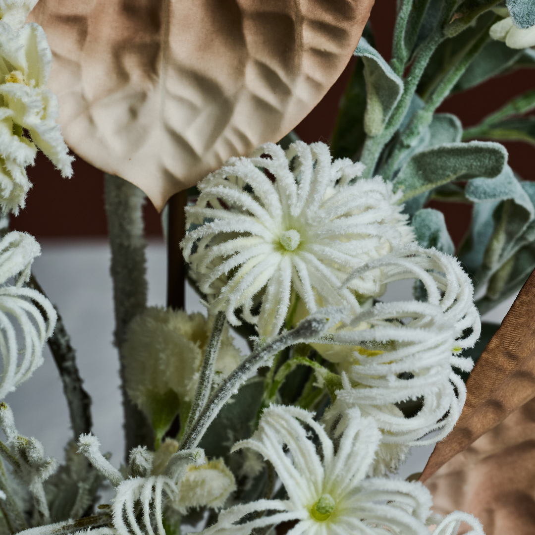Très grande tige de clématite enneigée qui s'intègre parfaitement dans un intérieur coloré et chaleureux. Idéale comme décoration de Noël. Peut être pliée et disposée pour orner un sapin.
