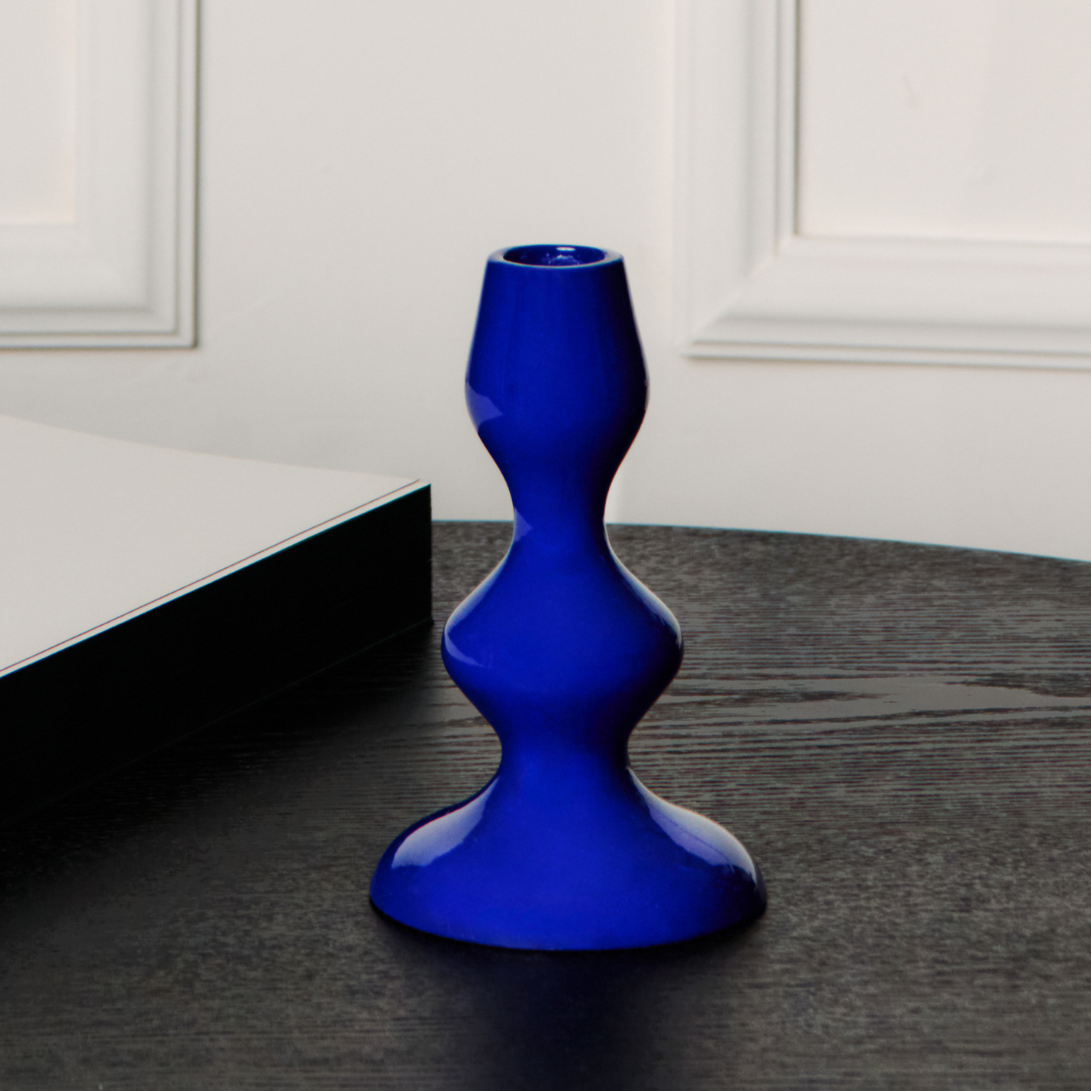 Candélabre bleu roi arrondi. Parfait pour accueillir nos longues bougies RUSTIC. Ses courbes apportent une touche moderne et chic à votre table. Existe en quatre versions différentes : bougeoir seul ou bougeoir avec support en verre transparent cylindrique.