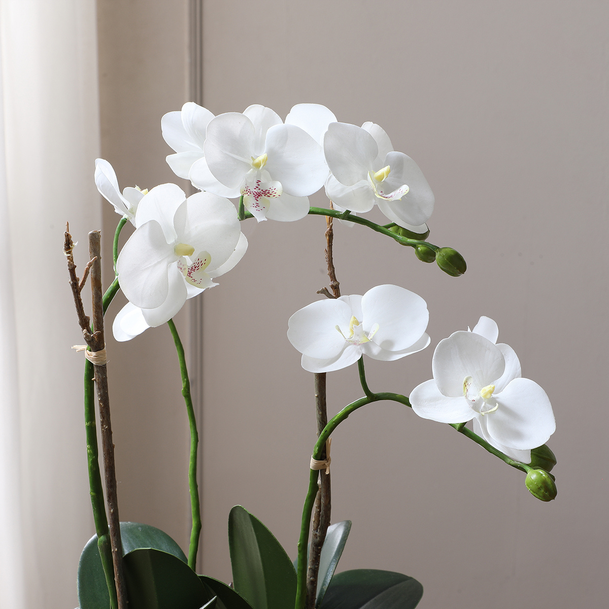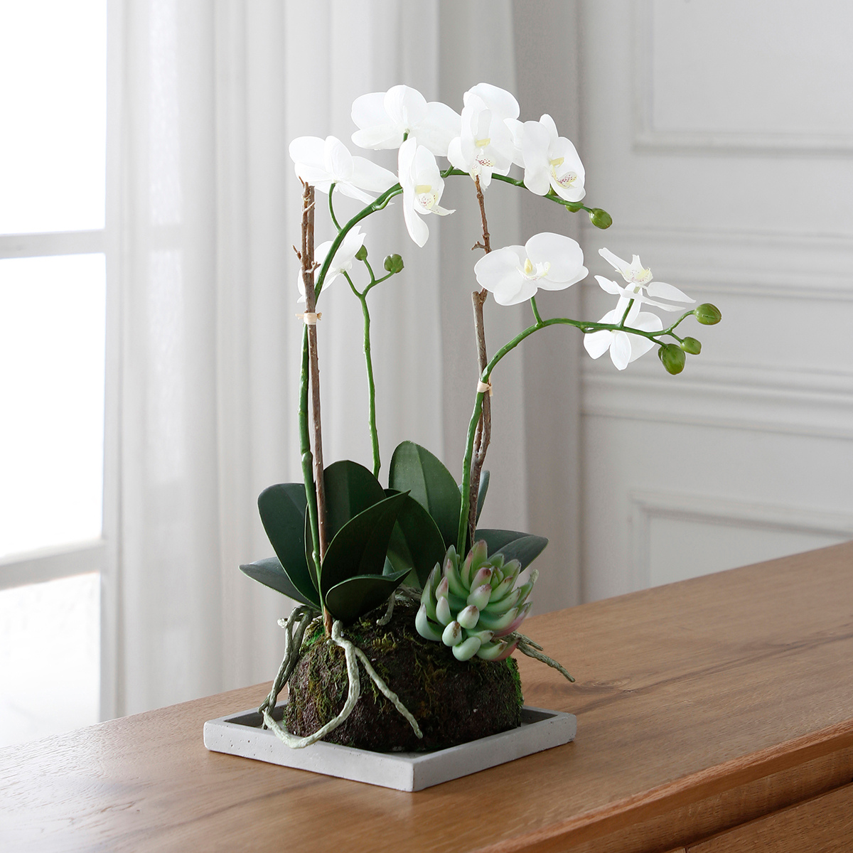 Composition florale d'orchidées blanches et de succulentes vertes sur un plateau gris en ciment recouvert de fausse terre et fausse mousse. Pour apporter une touche élégante et fraiche à votre décoration d'intérieur. L'orchidée est une fleur magnifique qui convient à toutes les saisons et égaye votre intérieur. Une façon simple et élégante d'ajouter une touche raffinée à votre décor. En plus d'être une fleur splendide, l'orchidée convient à toutes les saisons et apporte une fraicheur inégalée à votre intérieur. Avec sa combinaison unique de fleurs et de plantes artificielles, cette composition vous garantit un effet naturel sans les contraintes d'entretien.