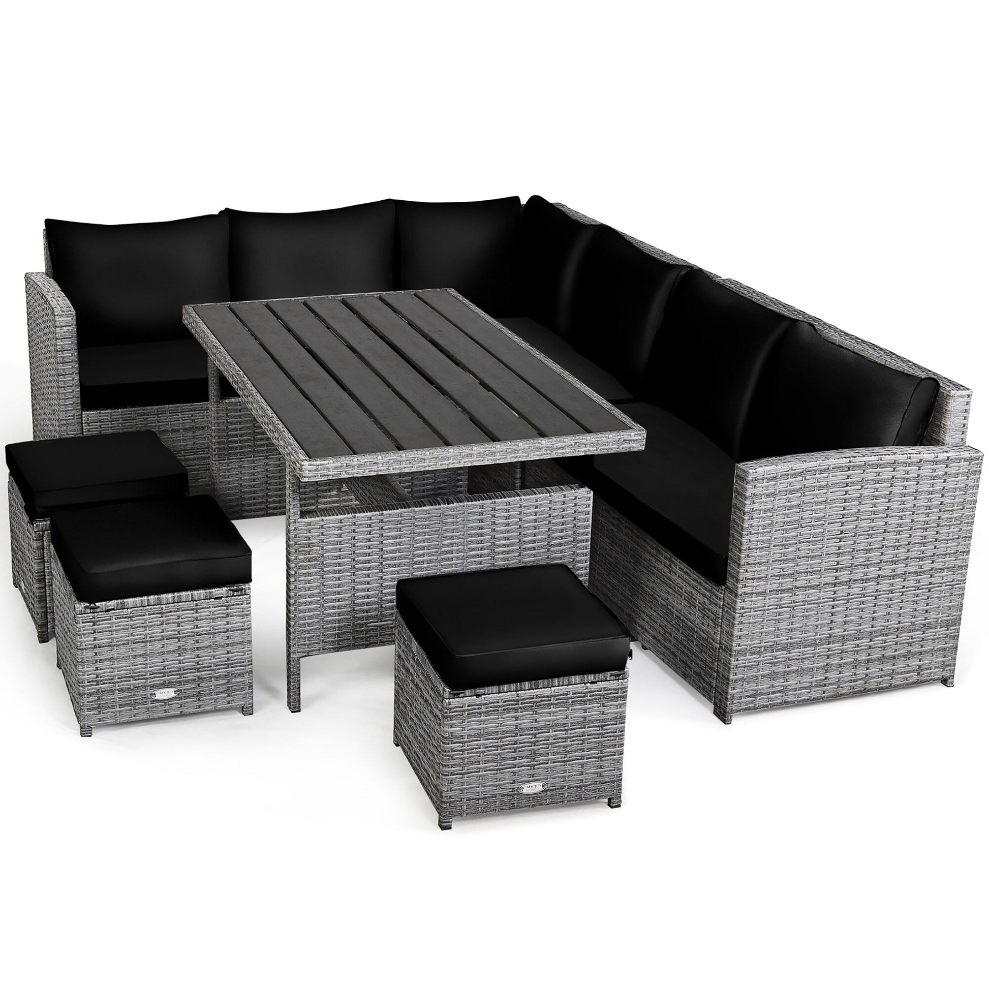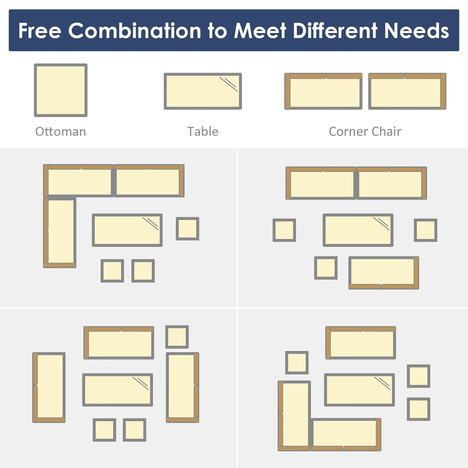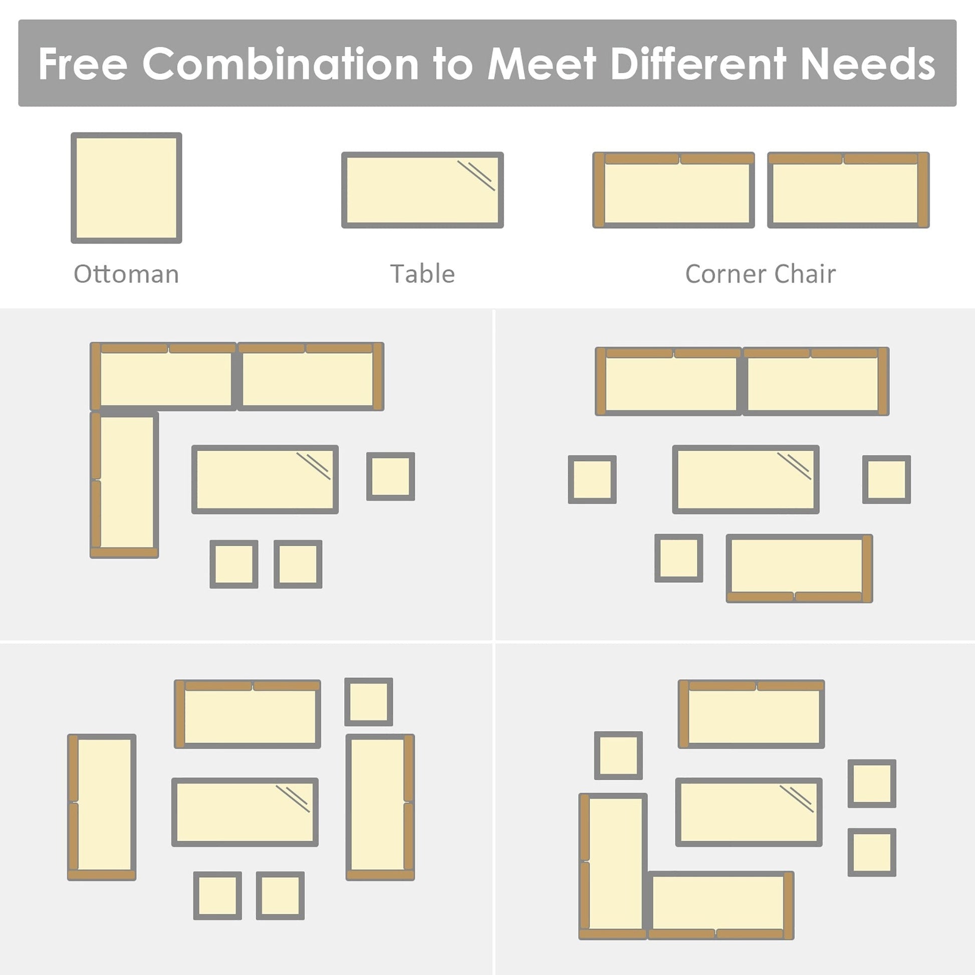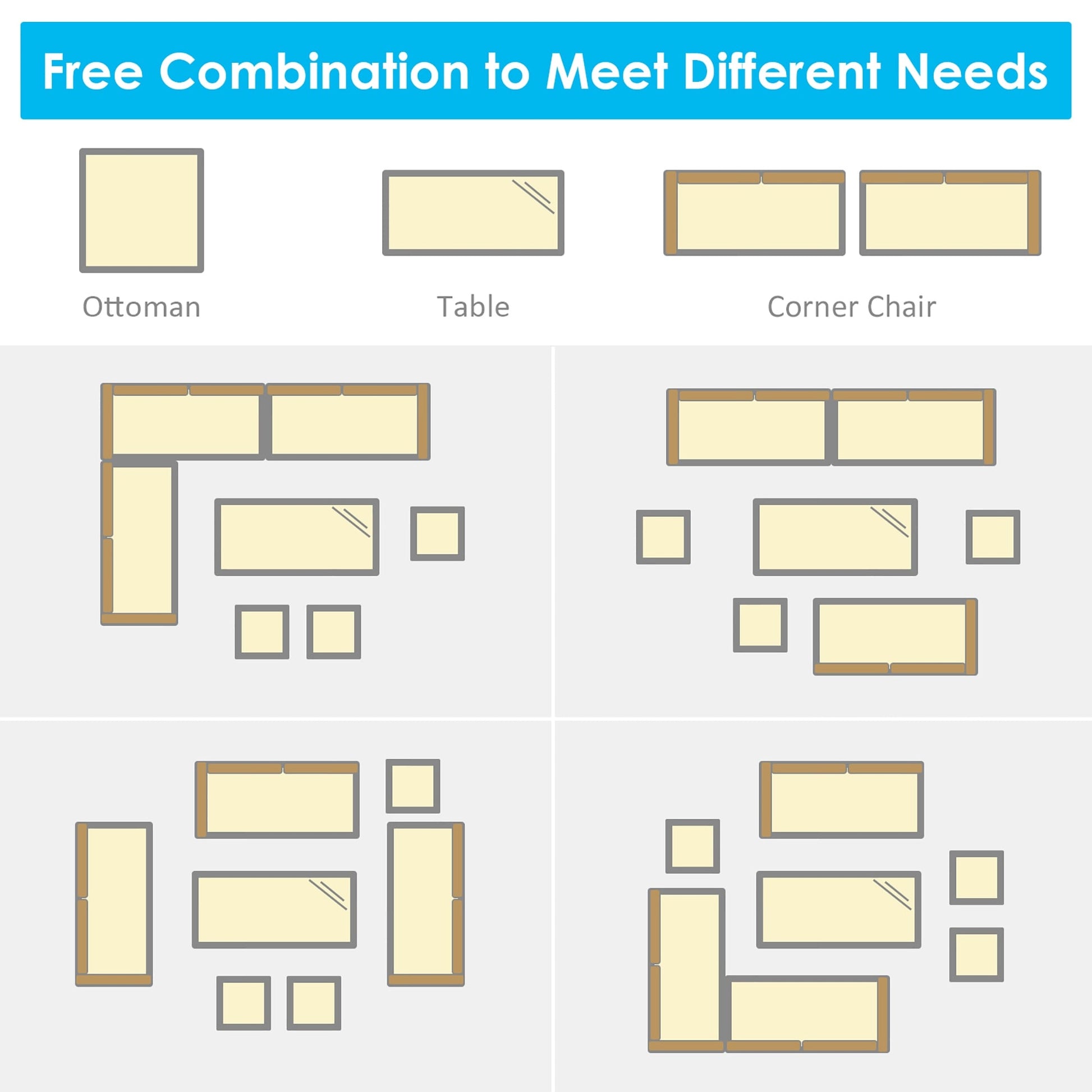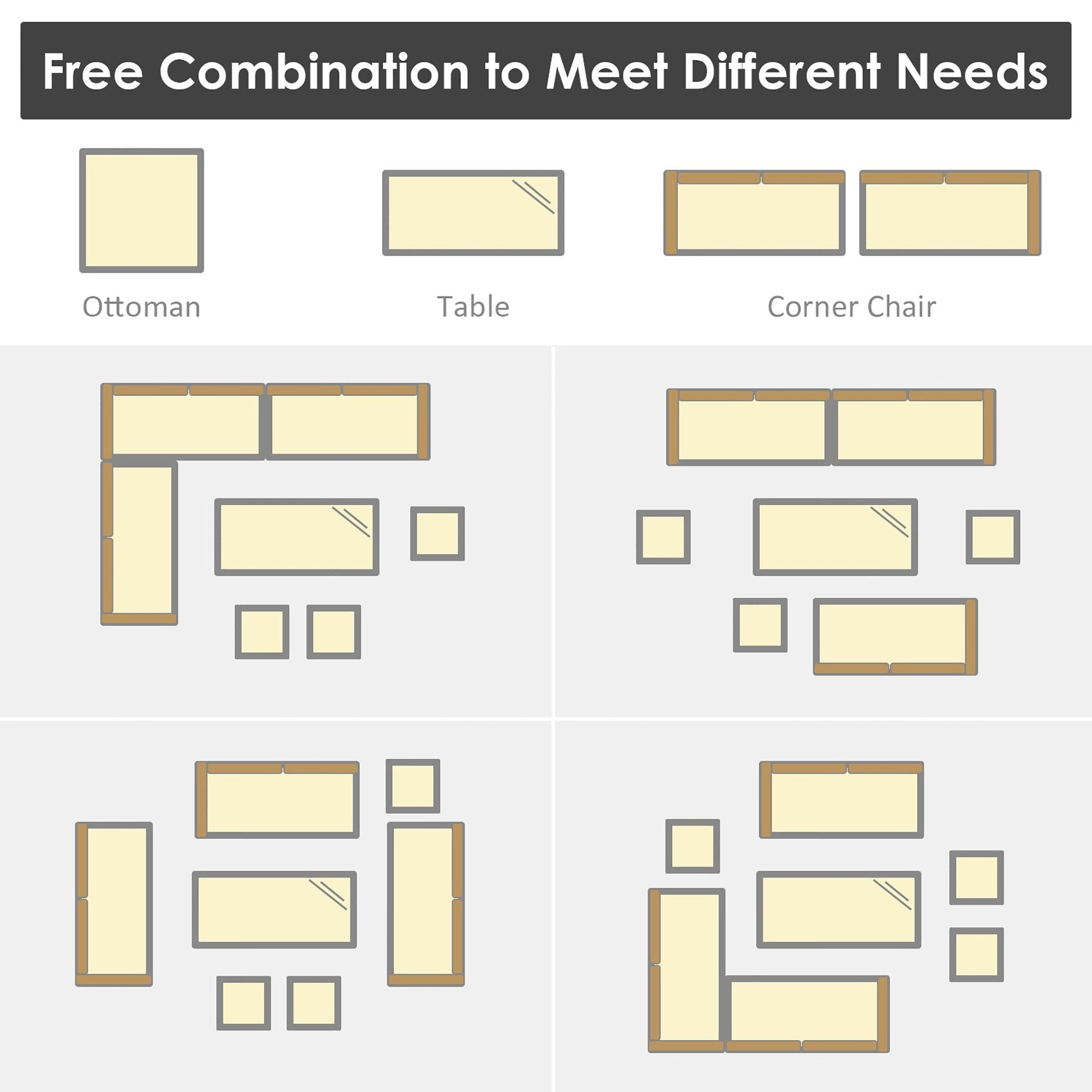 Feature Includes 3 corner chairs, 1 table and 3 ottomans for versatile use Powder coated steel structure provides strong durability and stability All weather and wear-resistant rattan ensures long lasting use Lofty sponge padded cushions for more comfort and relaxation Table with spacious top to hold your drinks, meals and more Washable and removable cushion cover with zipper for easy cleaning The cushion of ottoman is designed with ropes to keep it in position Flexible combination to meet your different needs and preference Perfect outdoor wicker furniture for yard, patio, poolside, porch, etc Anti-slip foot pads provide added stability and floor protection Ergonomic design with high backrests and wide armrests Easy to assemble and clean with damp cloth