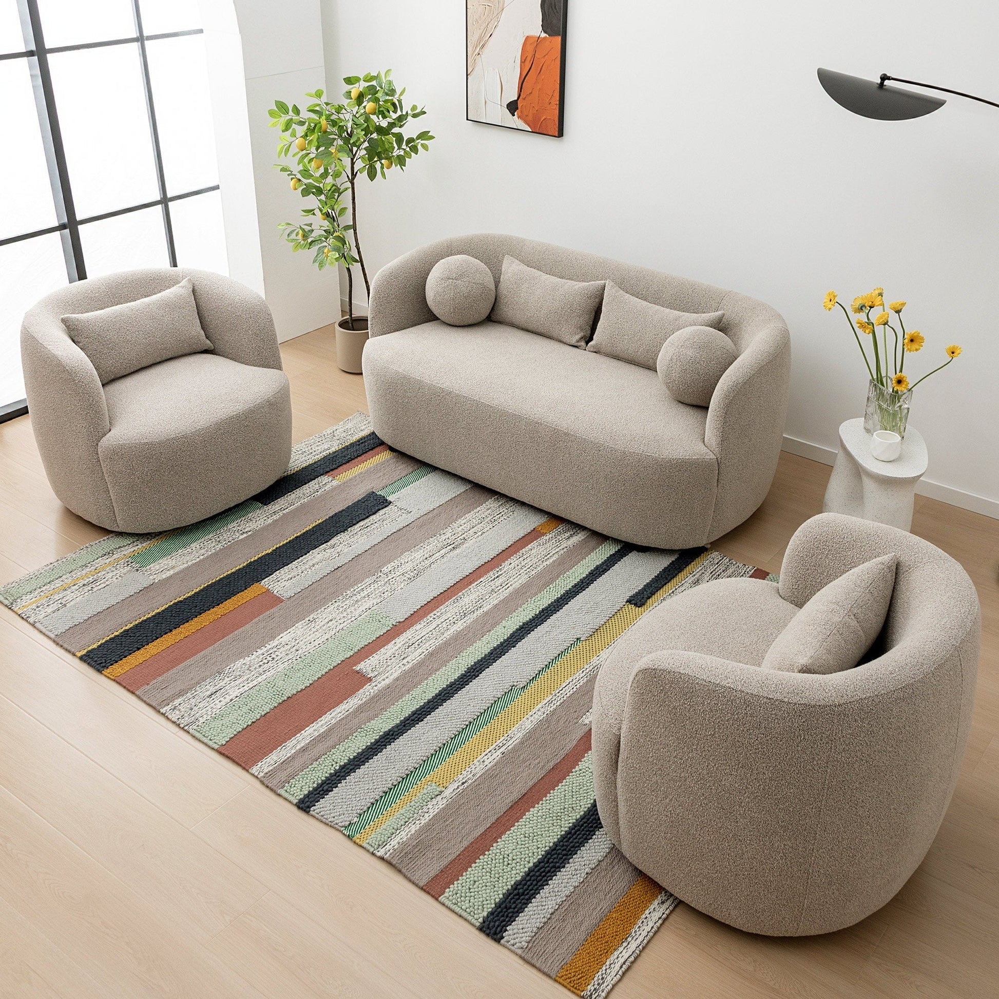 The loveseat sofa is a stunning piece of furniture that draws inspiration from the modern design aesthetics of the middle ages. This sofa comes with four pillows, two square pillows, and two spherical pillows, which provide exceptional comfort and support for the back and neck. With its compact size, this boucle sofa is perfect for small spaces and can accommodate up to two people comfortably. The natural sturdy frame is wrapped in supportive foam cushioning and durable boucle fabric, which ensures both comfort and durability.