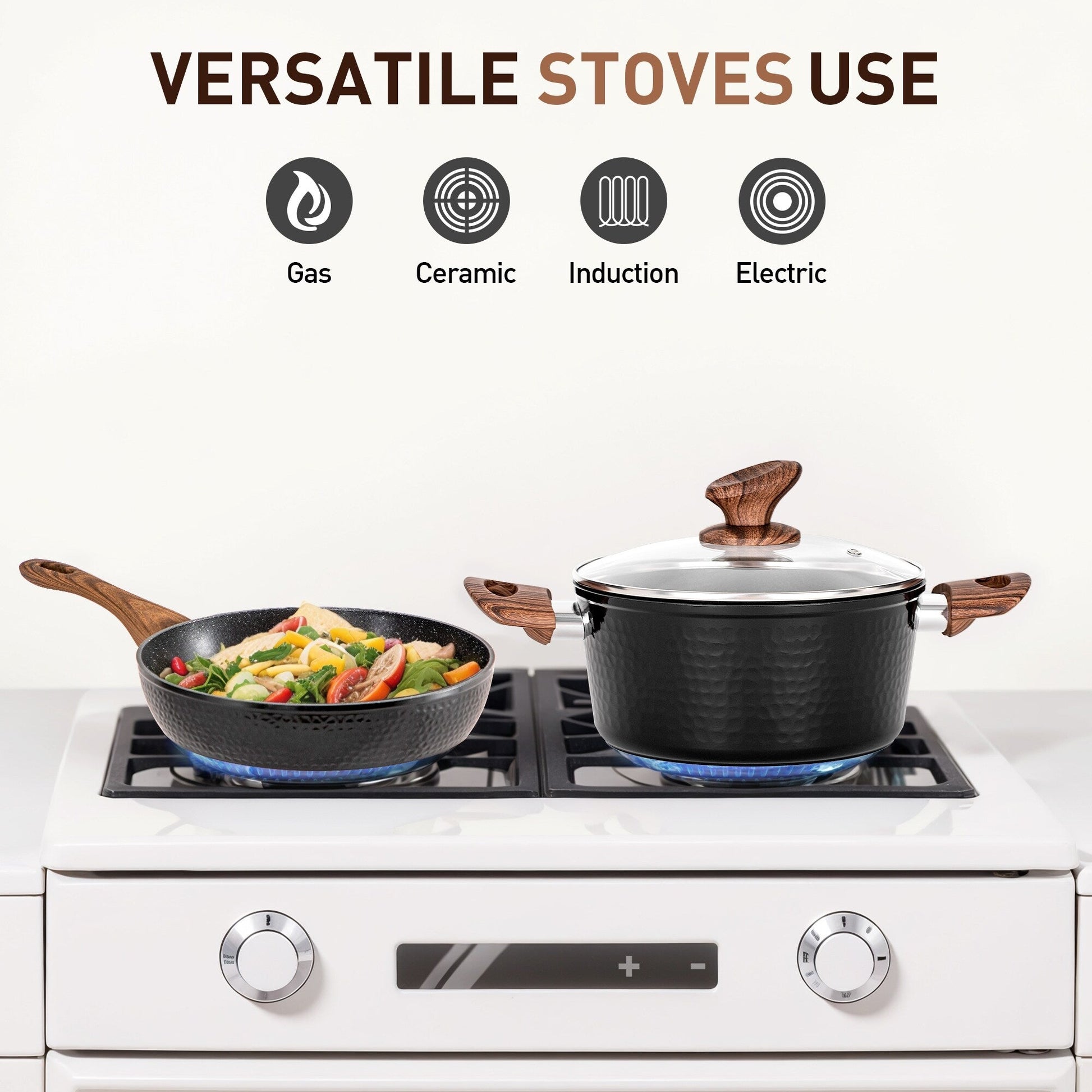 • Set includes 8.15-inch and 9.75-inch fry pans, 1.5qt and 3qt saucepans with lids, 3qt and 5qt casseroles with lids, and 5 nylon utensils