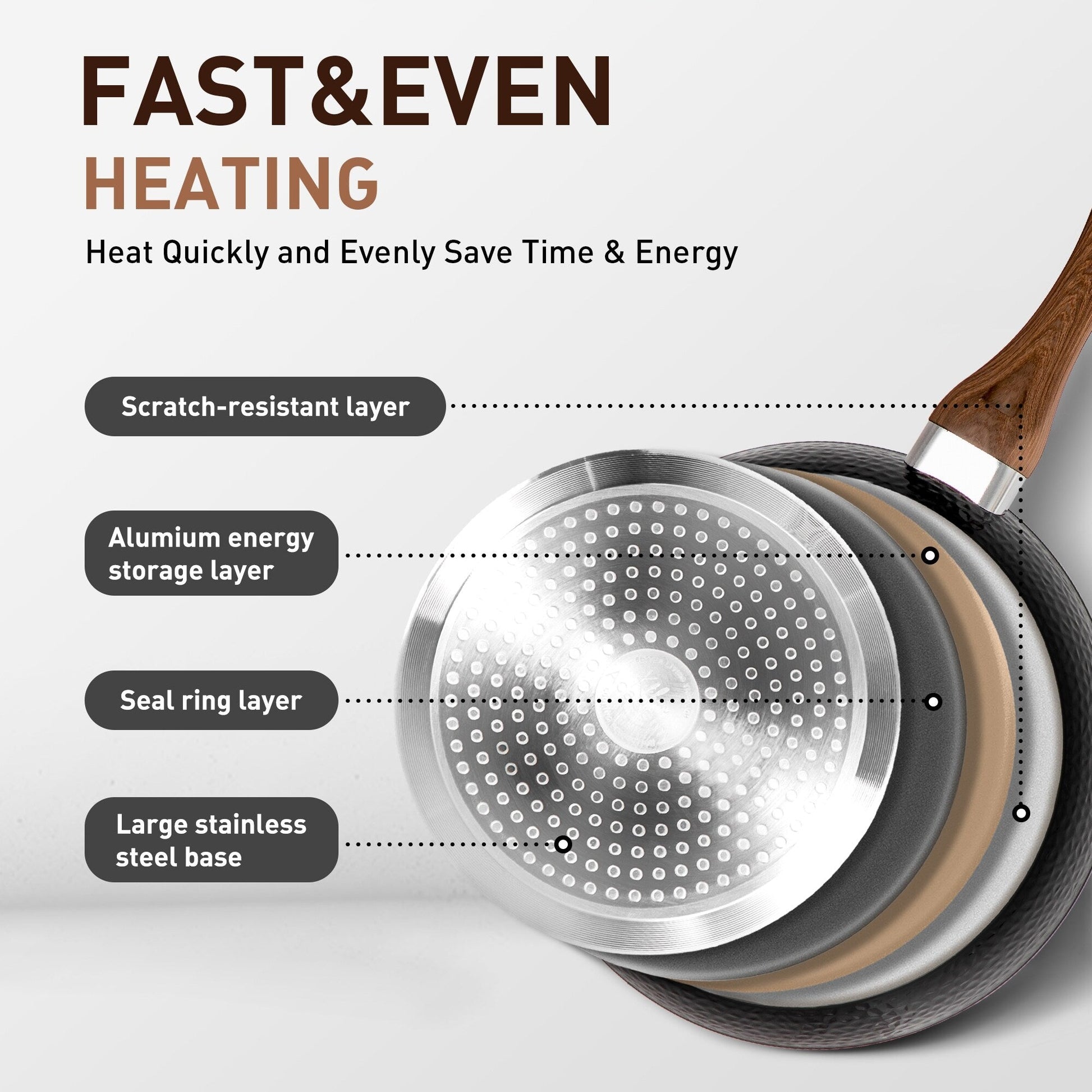 Upgrade your cooking game with our 15-piece nonstick granite-coated cookware set from Kitchen Academy. This top-of-the-line set includes all the pots and pans you need, along with five utensils to make meal prep a breeze. The eco-friendly natural marble coating on the interior combines with the high-quality granite coating on the exterior to create an effective non-stick surface that ensures your food cooks evenly every time.