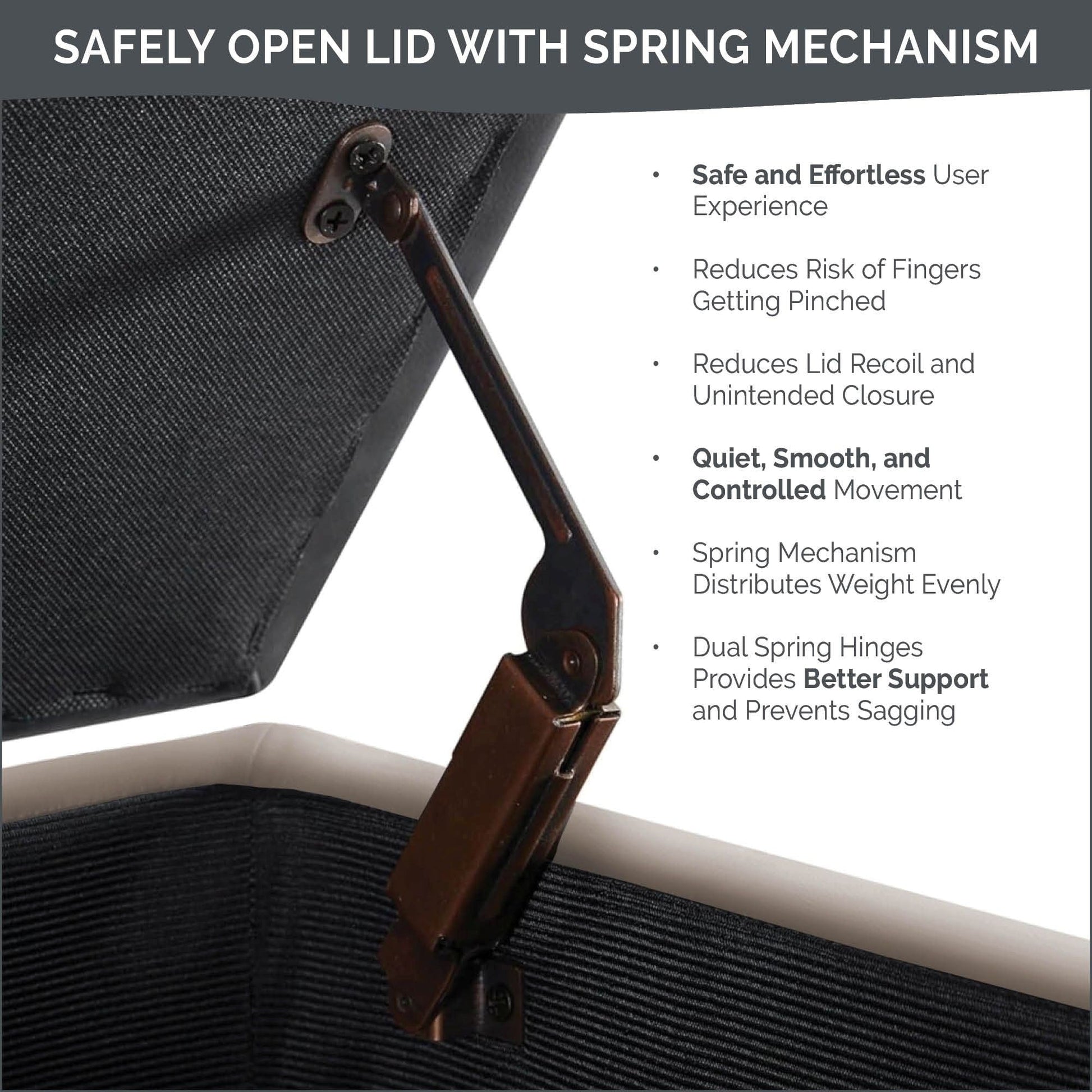 The Madison Park Shandra Upholstered Storage Bench blends style and function with a tufted button top and a spacious interior compartment (44.5'W x 15'D x 11'H) for concealed storage. Ideal for entryways, bedrooms, living rooms, nurseries, and small spaces, it offers both seating and storage. Two spring mechanisms, one on each end, provide quiet, smooth, and controlled movement, preventing the lid from slamming and enhancing durability. Upholstered in soft, durable fabric, it features a padded lid, solid wood legs, and sturdy construction. Easy assembly—just attach the legs. Add this versatile bench to your home today!