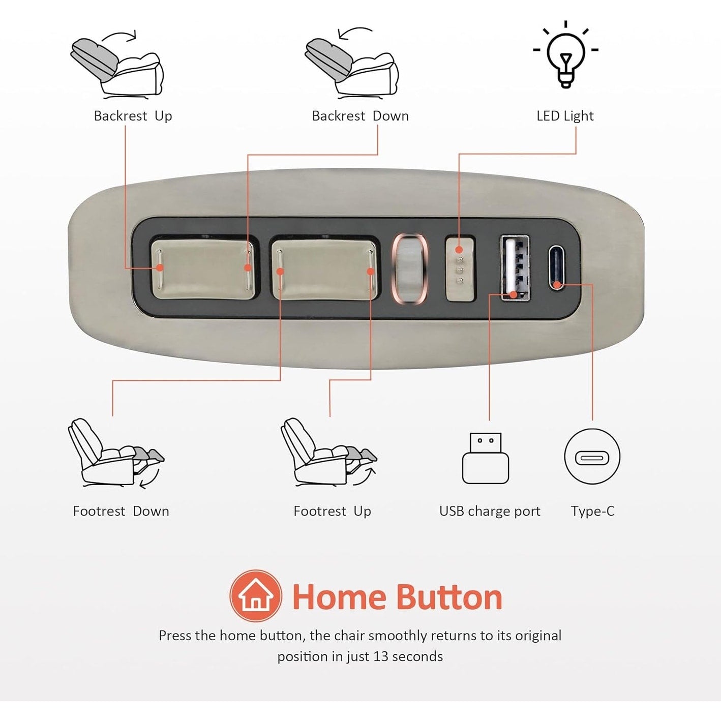 • ONE-TOUCH RESET & LED LIGHTING. Press the home button, and the chair smoothly returns to its original position in just 13 seconds. The dual USB &Type C ports on the armrest support any phone or pad, and LED lighting for added relaxation