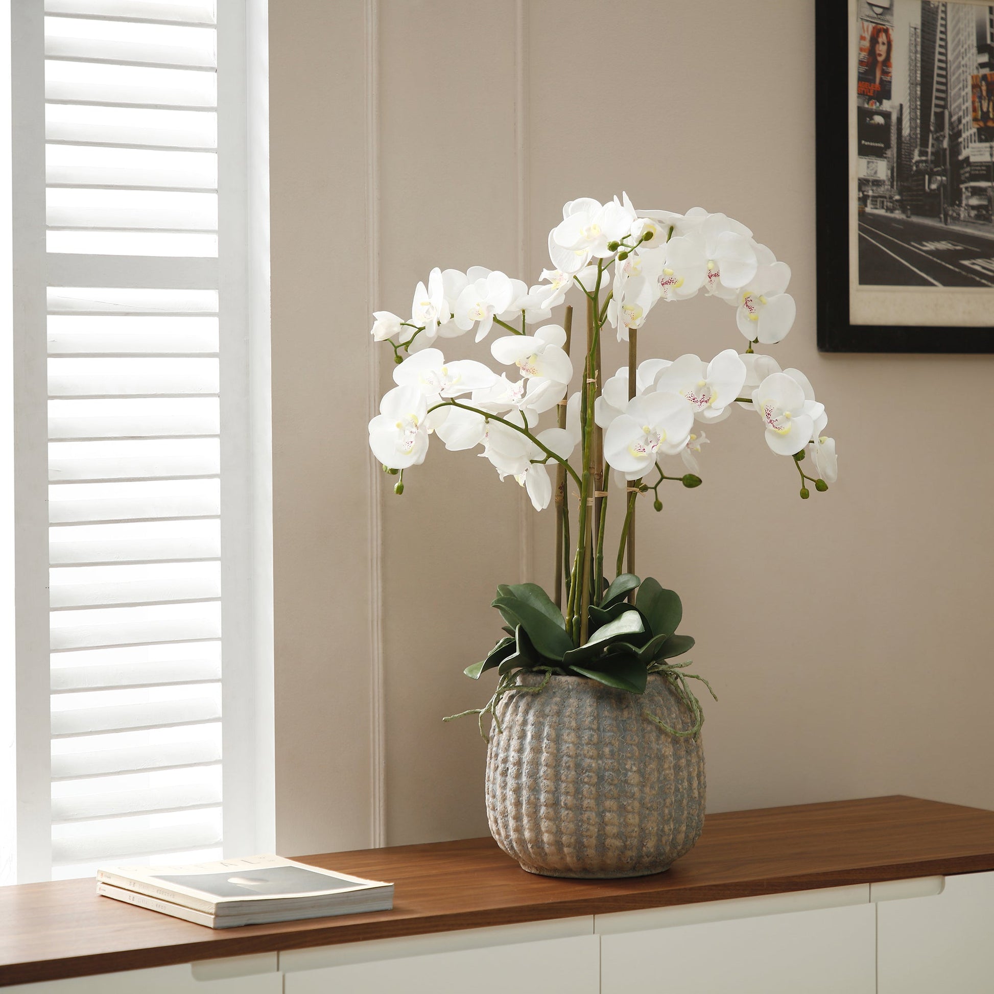 Orchidée phalae artificielle blanche avec 6 tiges, des feuilles, de la fausse terre et son pot en céramique gris strié très tendance. Sa fabrication de haute qualité assurera à votre orchidée une durabilité hors pair et conservera son étincelante beauté au fil du temps. L'orchidée est considérée comme la plus belle des plantes grâce à son élégance et à sa beauté naturelle. De plus, vous pourrez profiter de sa beauté toute l'année sans avoir à vous soucier de son entretien.