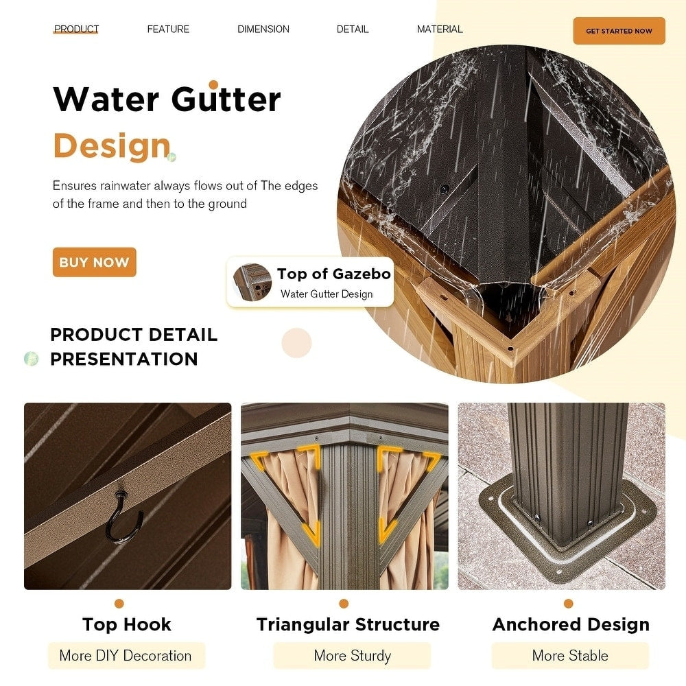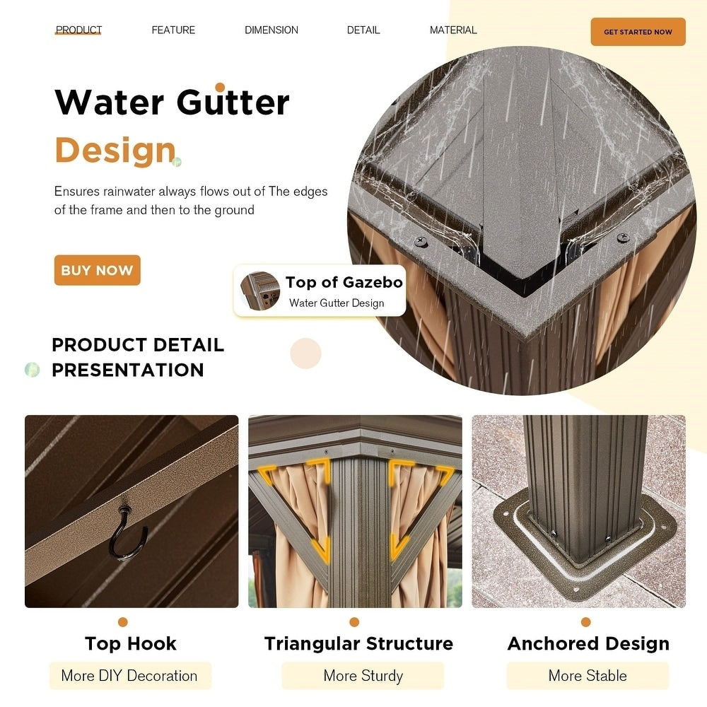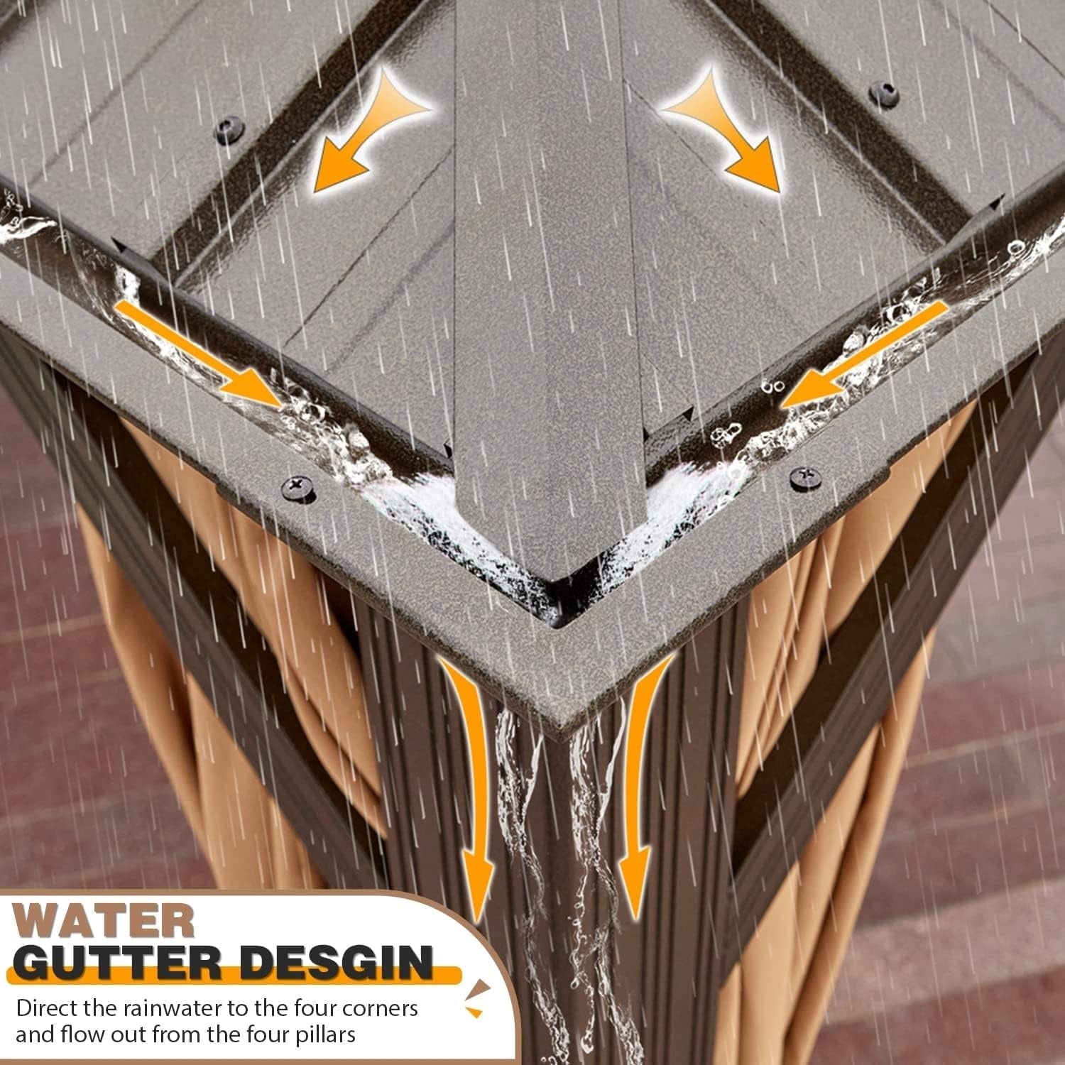 - For Compact Gazebos (Under 12' x 20'): Features angled eaves with a 4-corner runoff design — rainwater flows naturally along the sloped edges for smooth drainage.