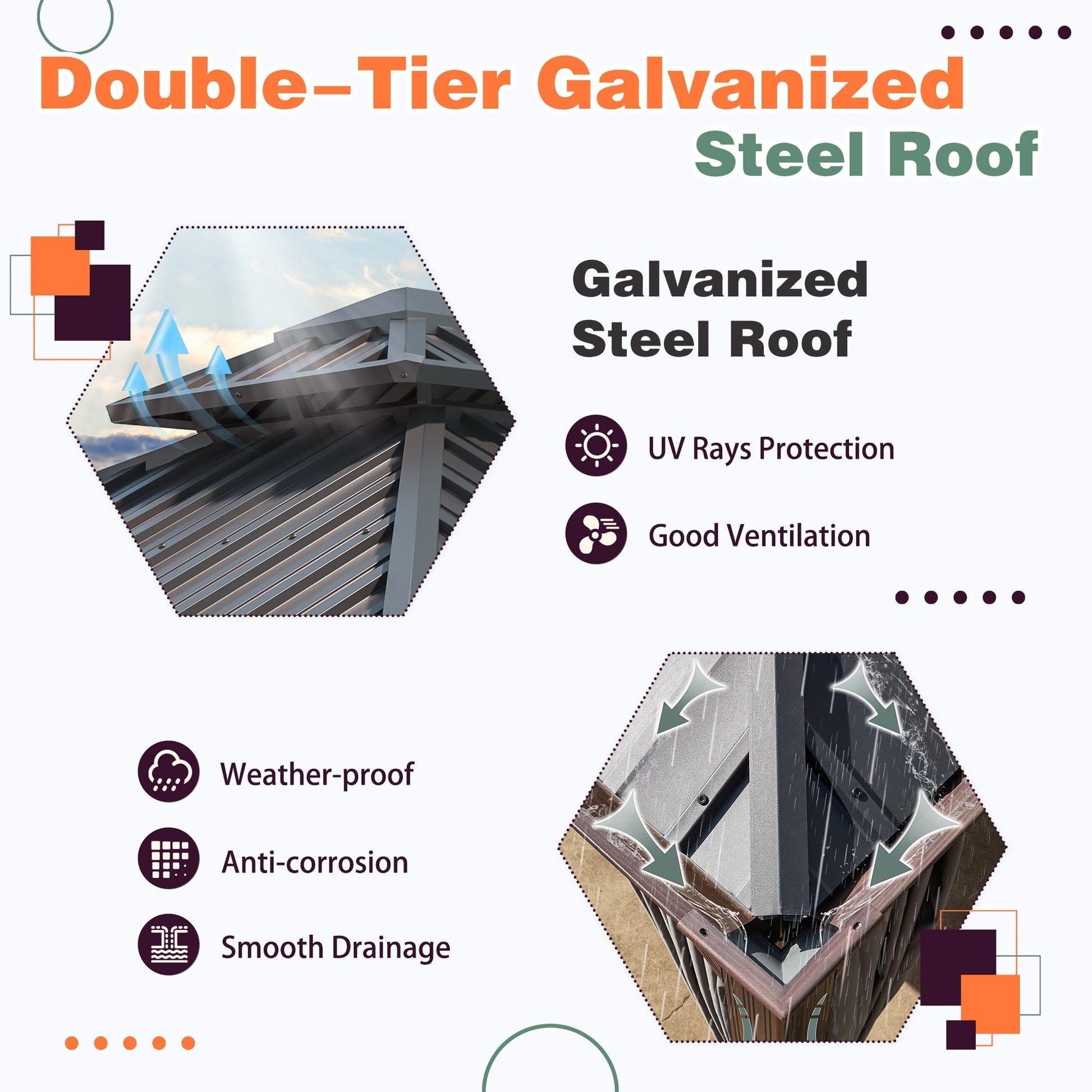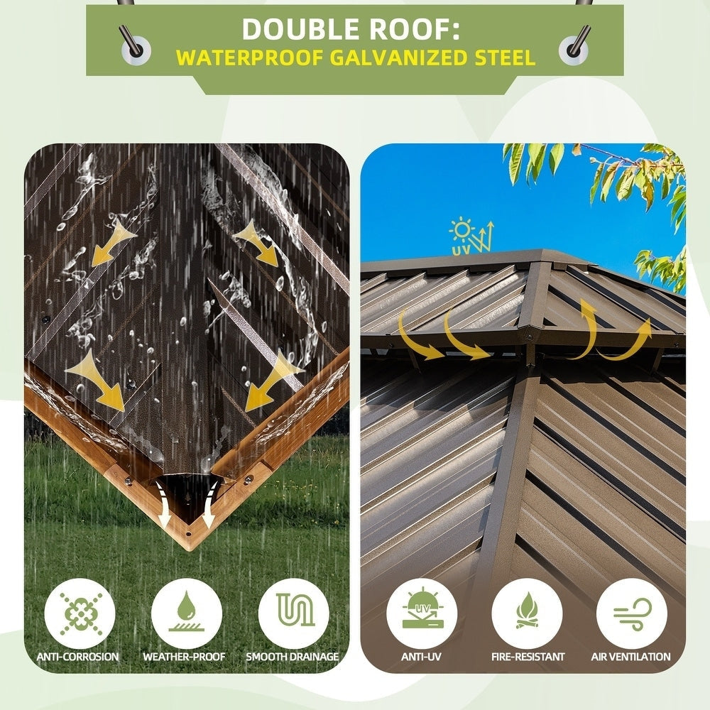 The roof of the hardtop gazebo is made of powder-coated galvanized steel, which not only enhances the gazebo's ability to withstand wind and snow, but also isolates it from direct contact with the air, making it less prone to rust and extending its lifespan.
