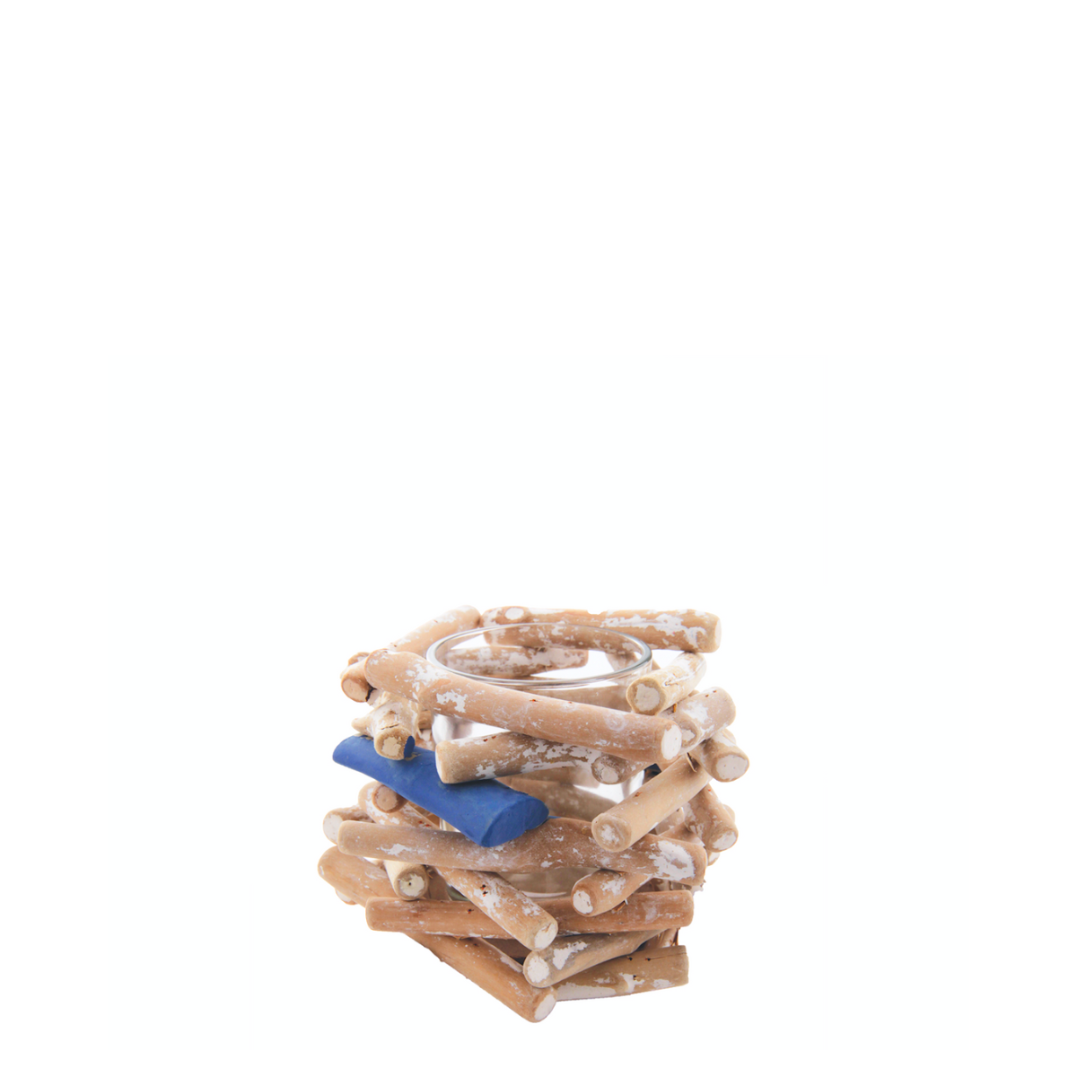 Photophore décorative en bois sec, mélange de couleurs naturelles, blanc et bleu, avec un intérieur cylindrique en verre pour protéger et stabiliser la bougie. Elle est conçue pour accueillir une bougie cylindrique à l'intérieur. Parfaite pour créer un intérieur épuré et naturel.