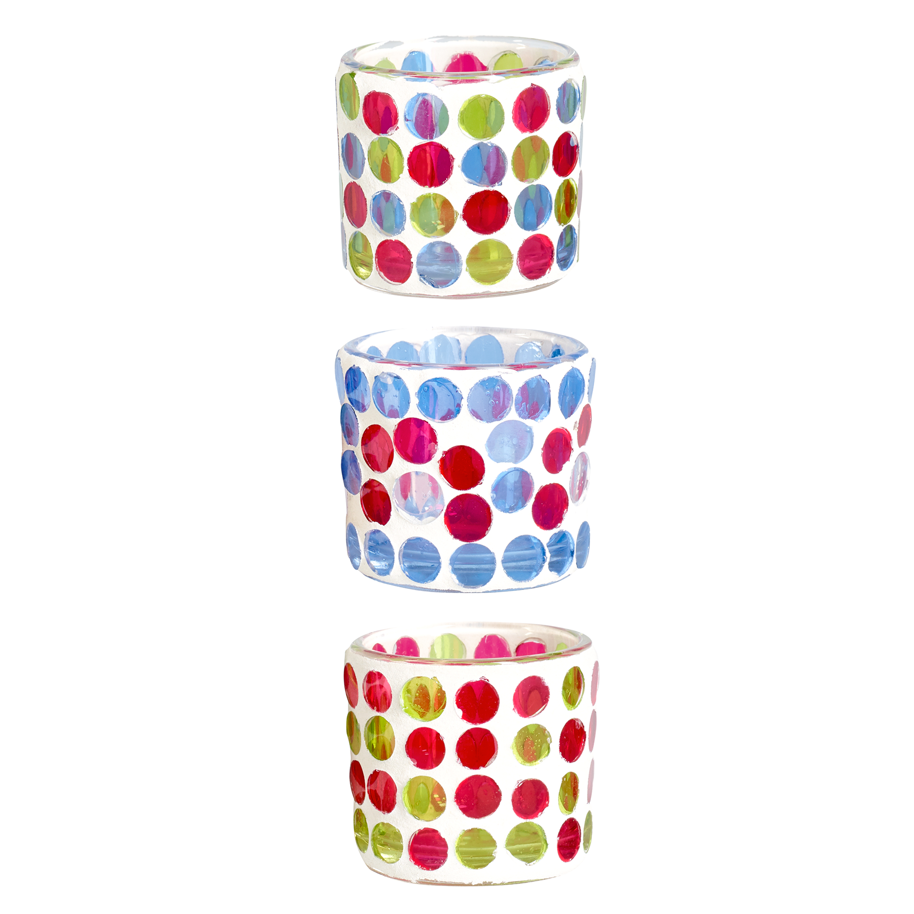 Ensemble de trois photophores à motif mosaïque multicolore. La transparence des pastilles de verre permettra de créer des reflets colorés dans votre intérieur. Pour un style joyeux et estival. Compatibles avec bougies chauffe-plat.