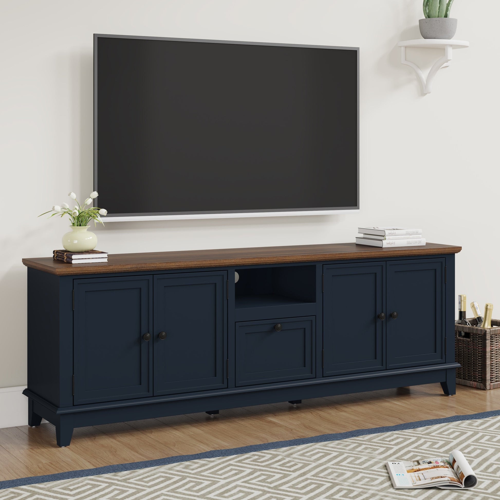 Elevate your entertainment space with our 72-inch TV stand, meticulously designed for both style and functionality. Featuring spacious left and right cabinets, adjustable shelves, and a large central drawer with an additional hidden compartment, this TV stand offers ample storage for all your media essentials.  The wood-grain textured top and vibrant blue finish of the cabinets break away from monotony, adding a touch of sophistication to your living room. The adjustable shelves and quick-install hinges make assembly a breeze, saving you valuable time.
