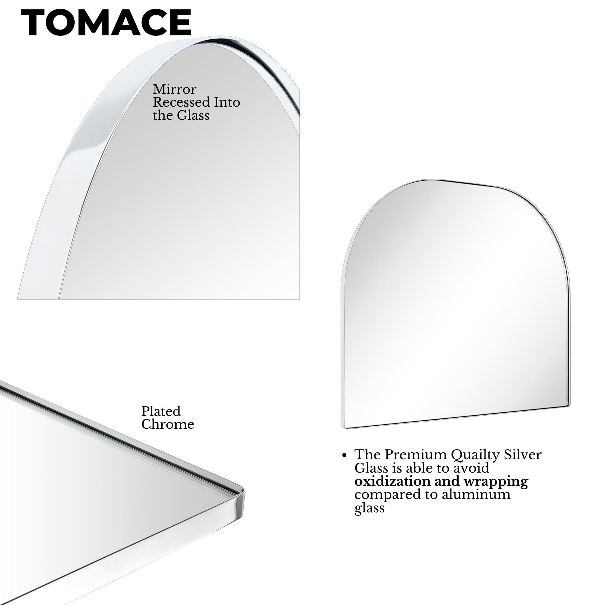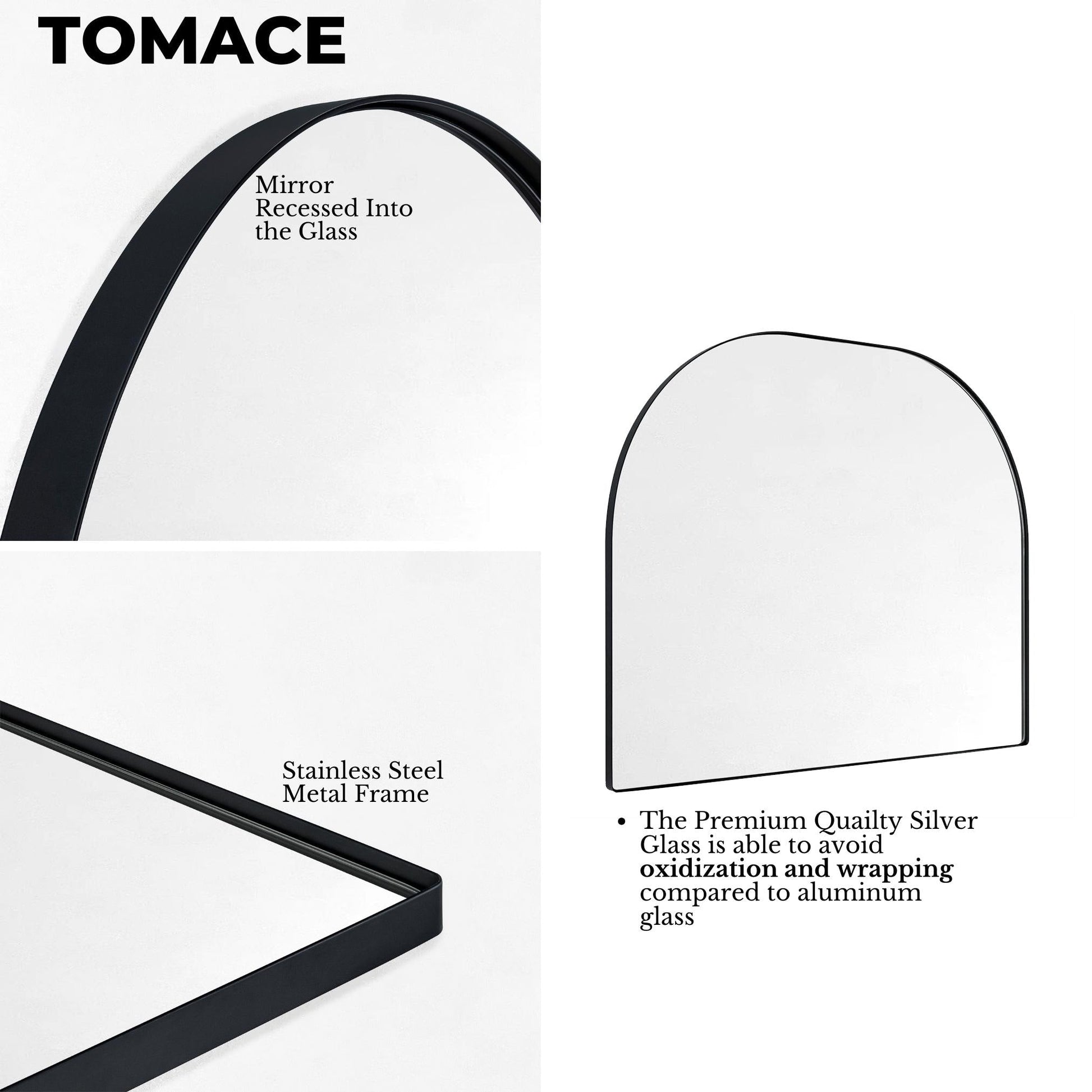 • Seamless Stainless Steel Frame: This arched  bathroom mirror uses preminum quality stainless steel material and 9mm  TSCA certified MDF backing to avoid both rust and corrosion when wall  mounted, making it safe for bathroom use as well.