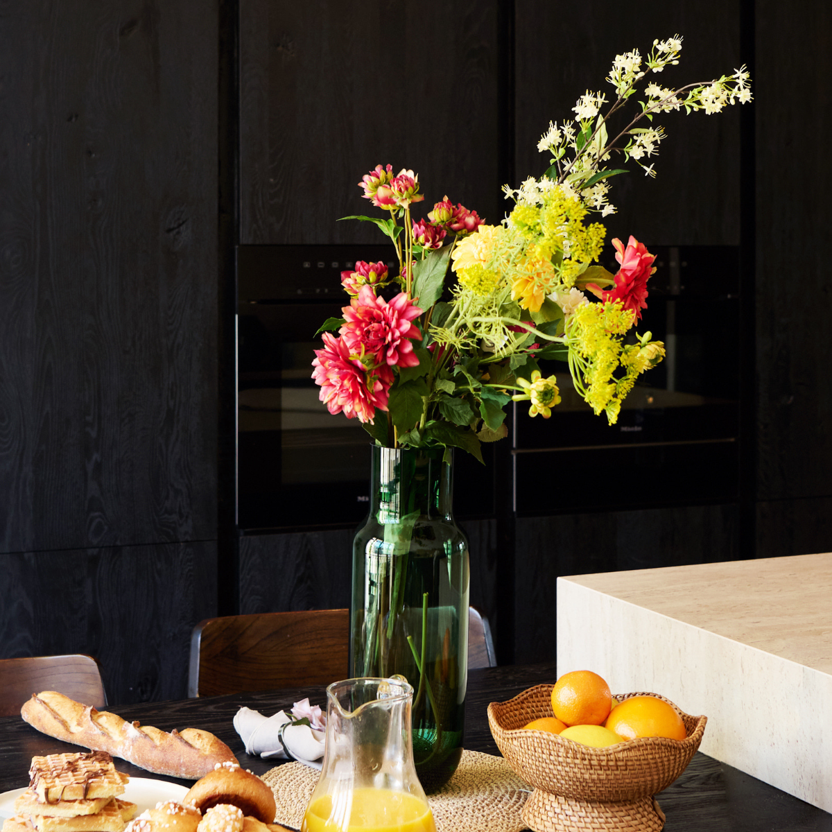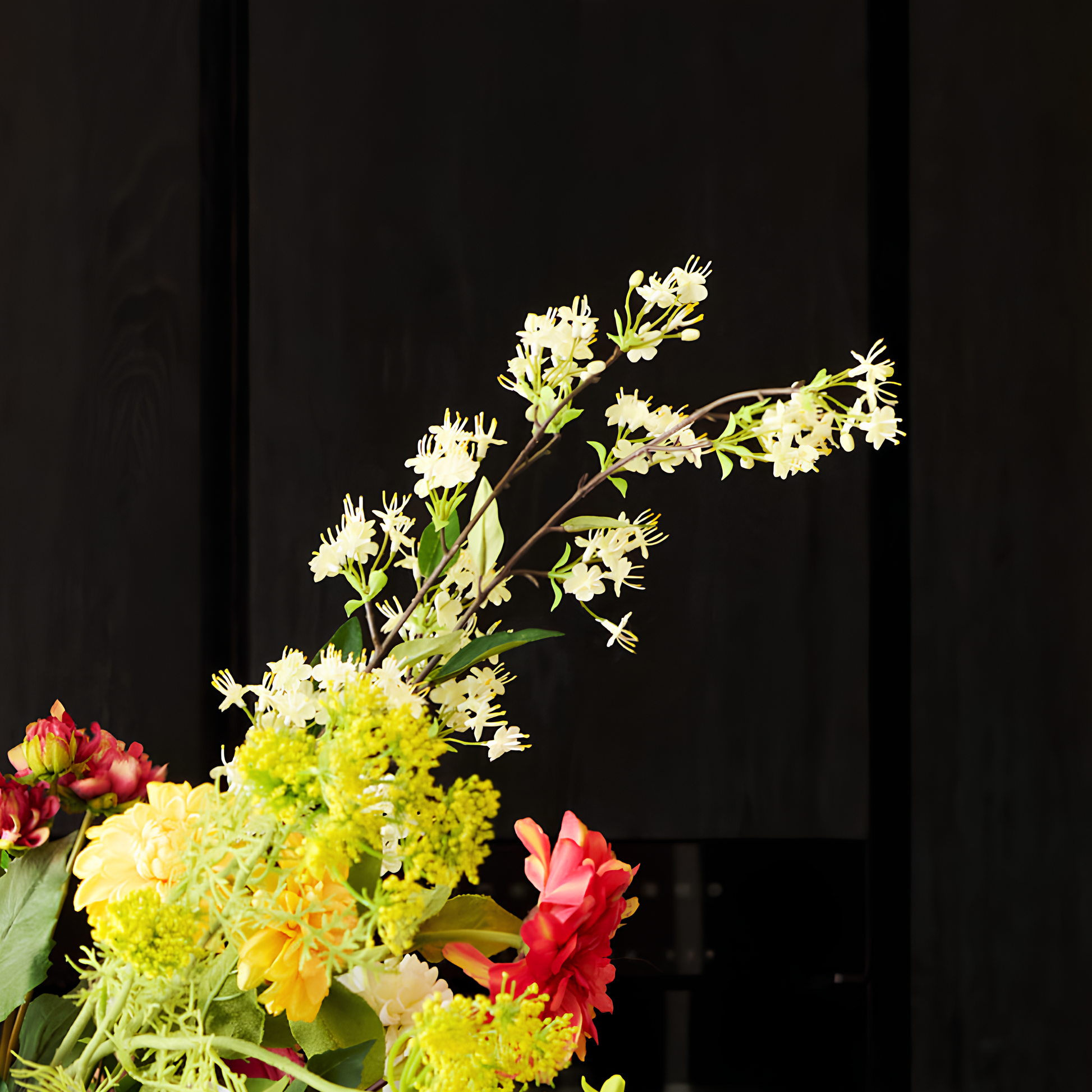 Tige artificielle de Dahlia avec feuilles et un bourgeon. Le dahlia apportera à votre intérieur une touche romantique et sobre grâce à sa généreuse tête de fleur.
