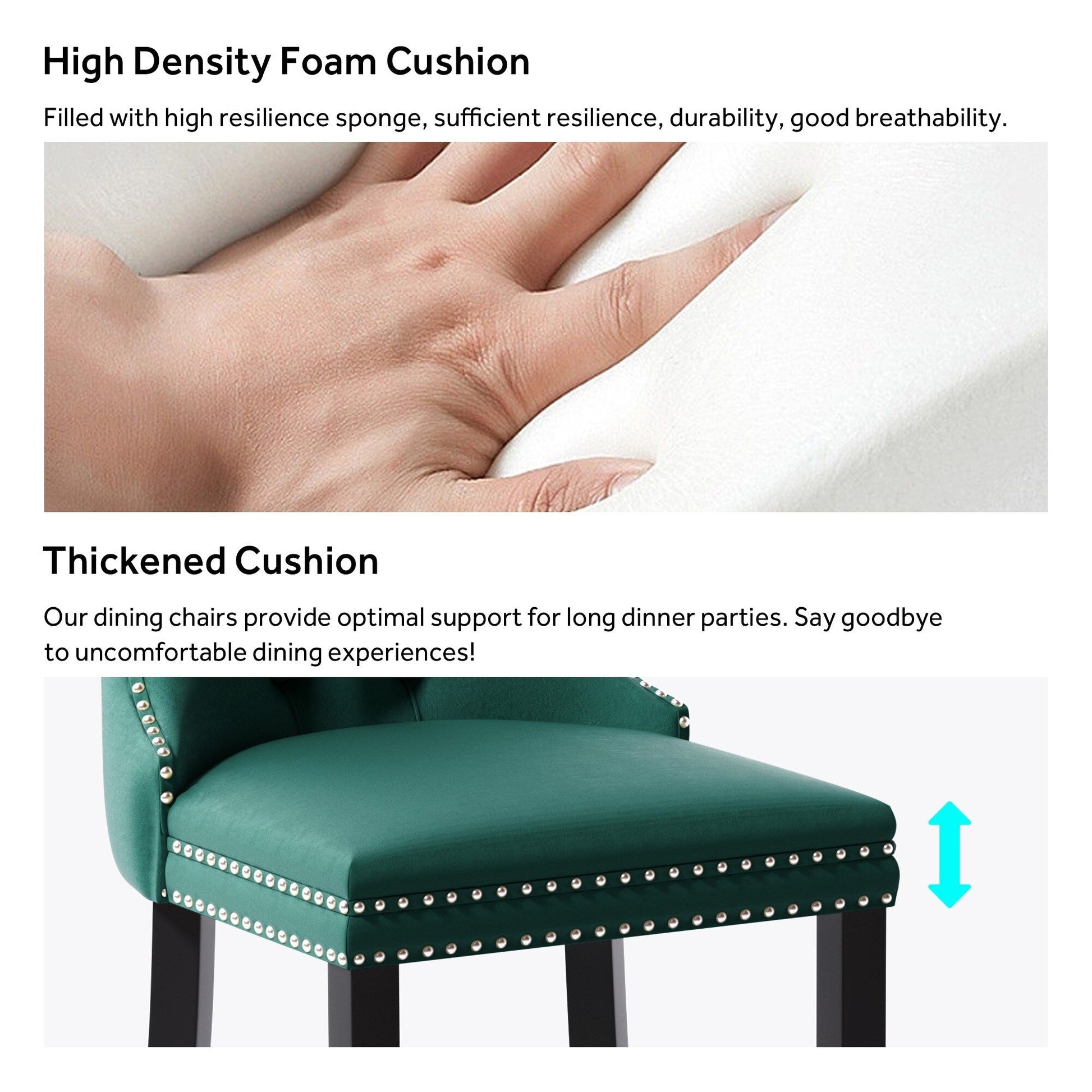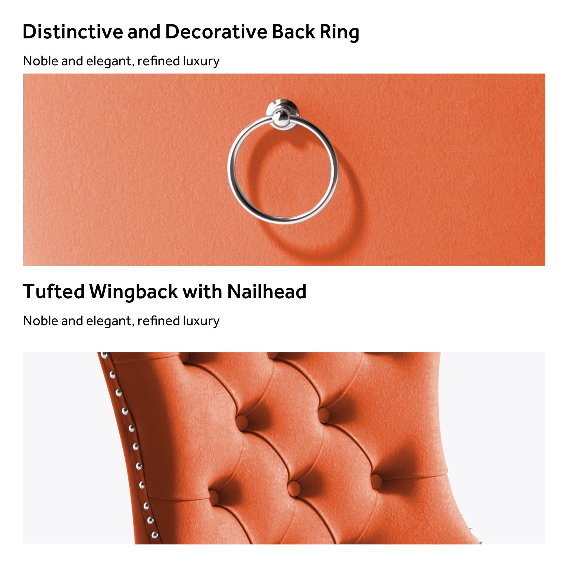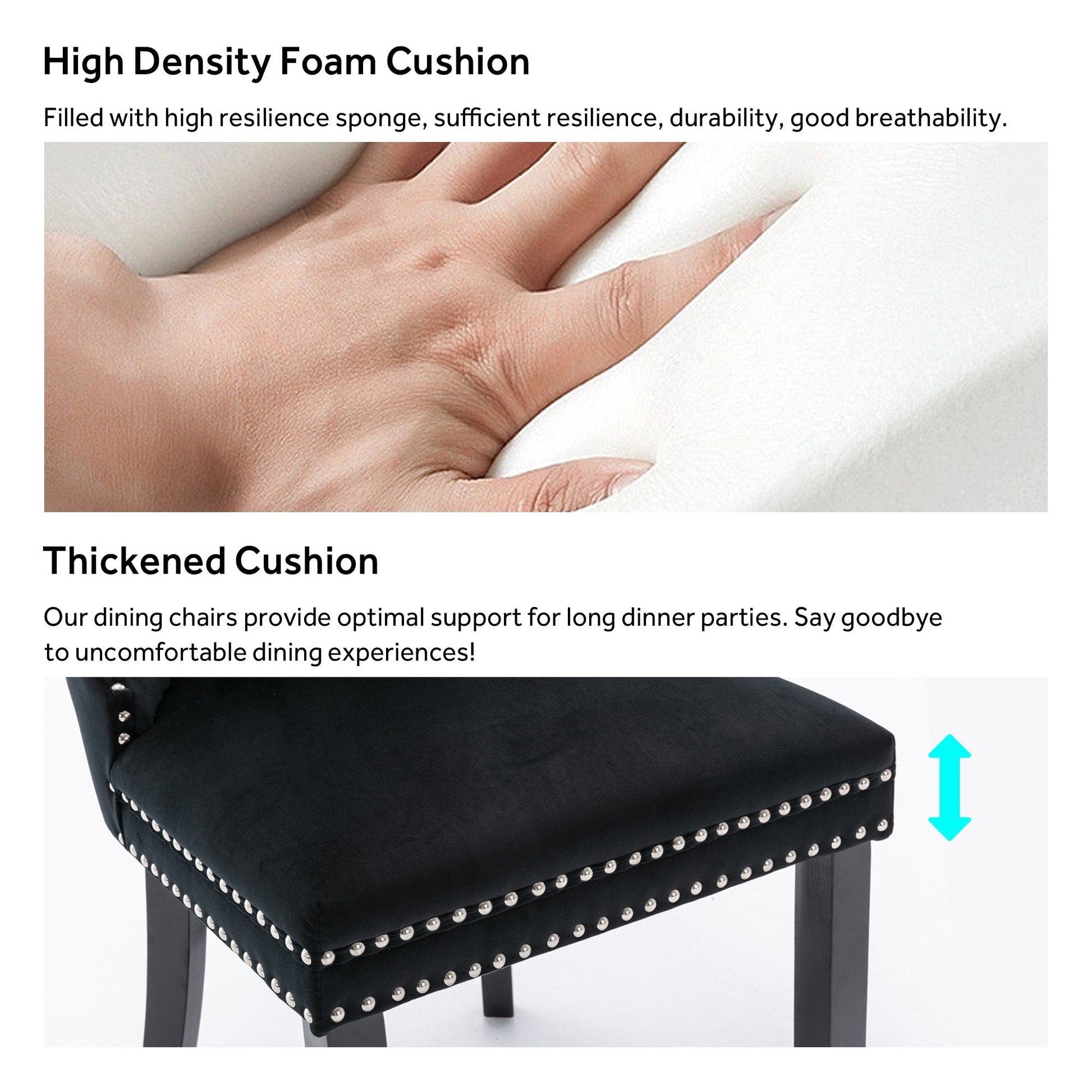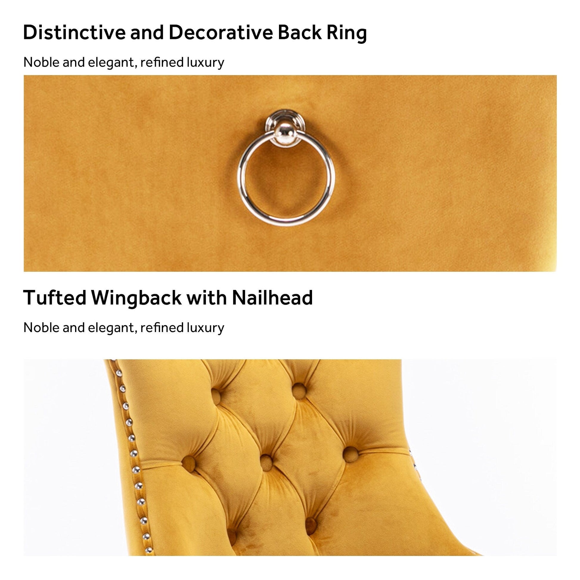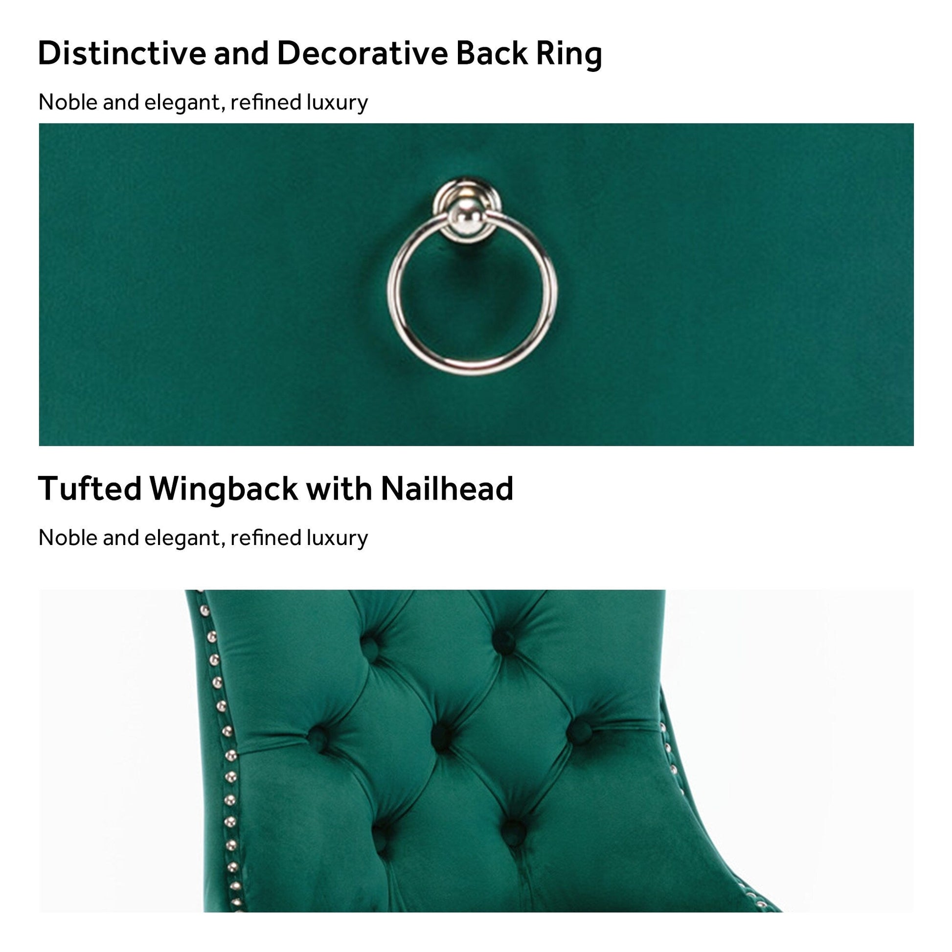 These wingback dining chairs are made of high-quality velvet fabric, which has super wear resistance and will not fade, the fabric is thick and luxurious, the touch is very delicate. This velvet dining chairs set featuring a very modern mid-century look. This dining chair set is equipped with high backrest for a strong comfortable back support. Plenty decorative rivet inset around cushion and back not only make it looks noble and elegant but also give the whole chair a feeling of exquisite luxury. We provide assembly instructions and assembly videos. If you have any questions, please contact us.