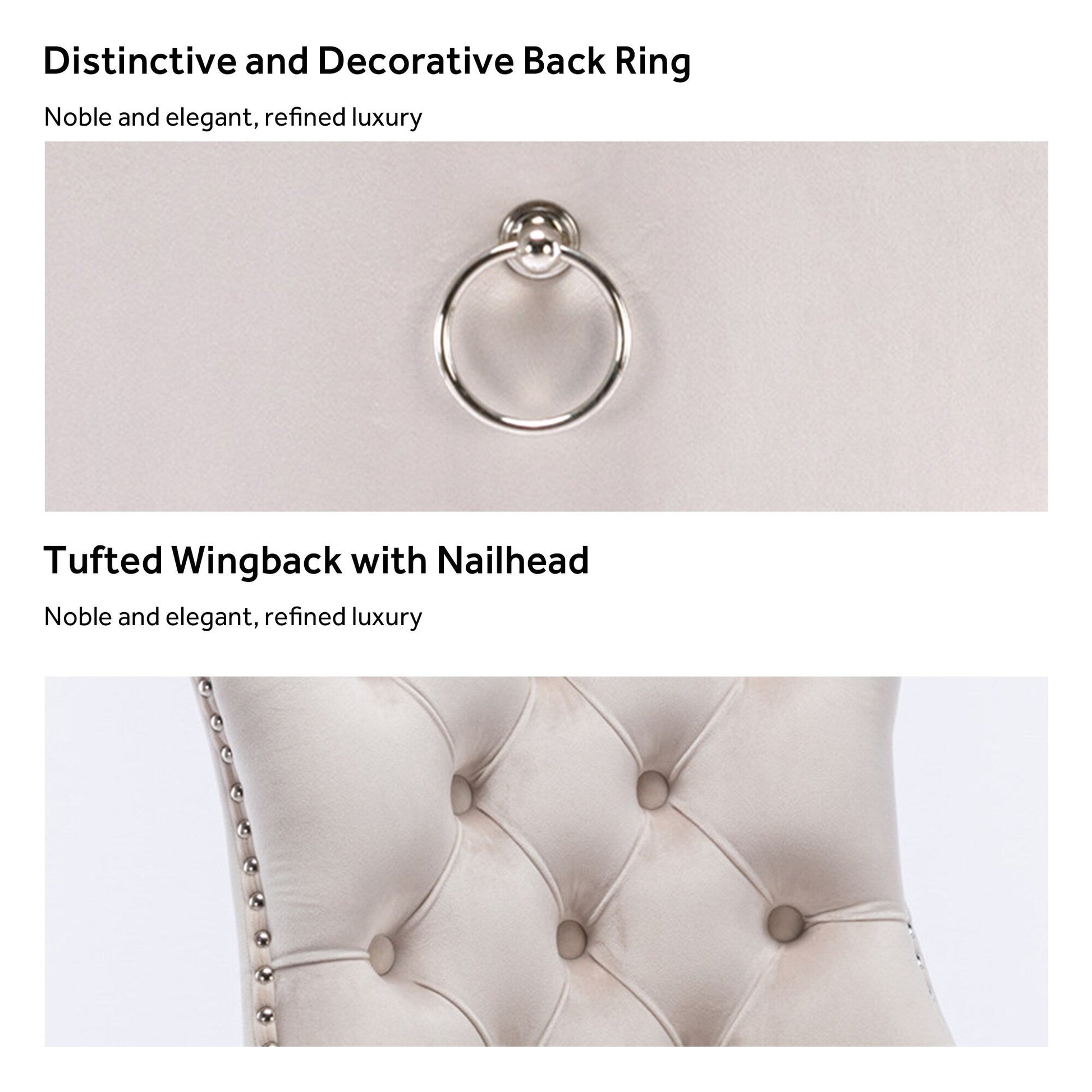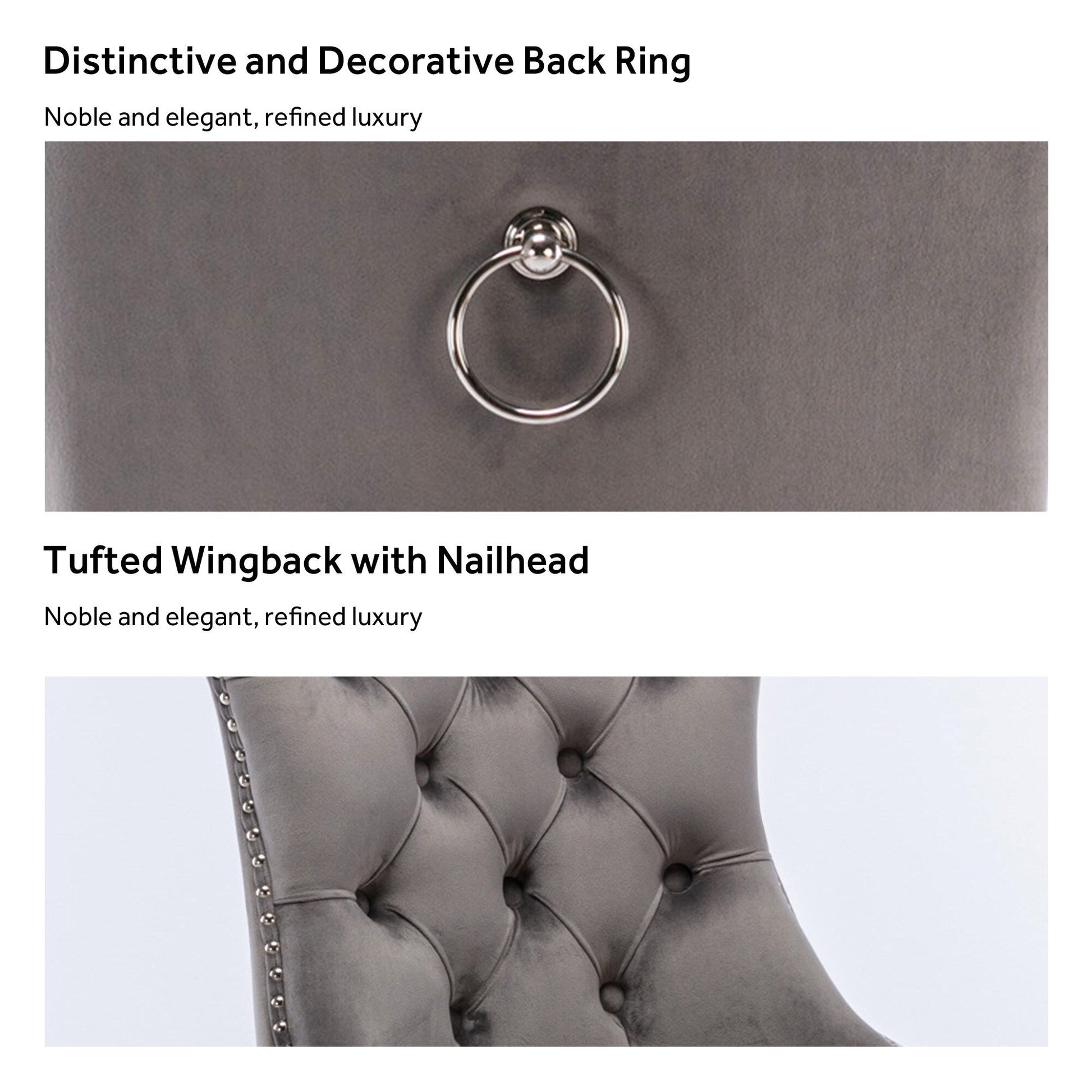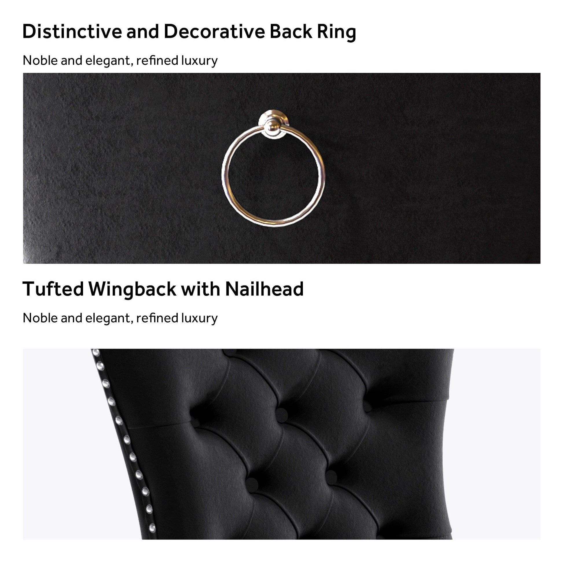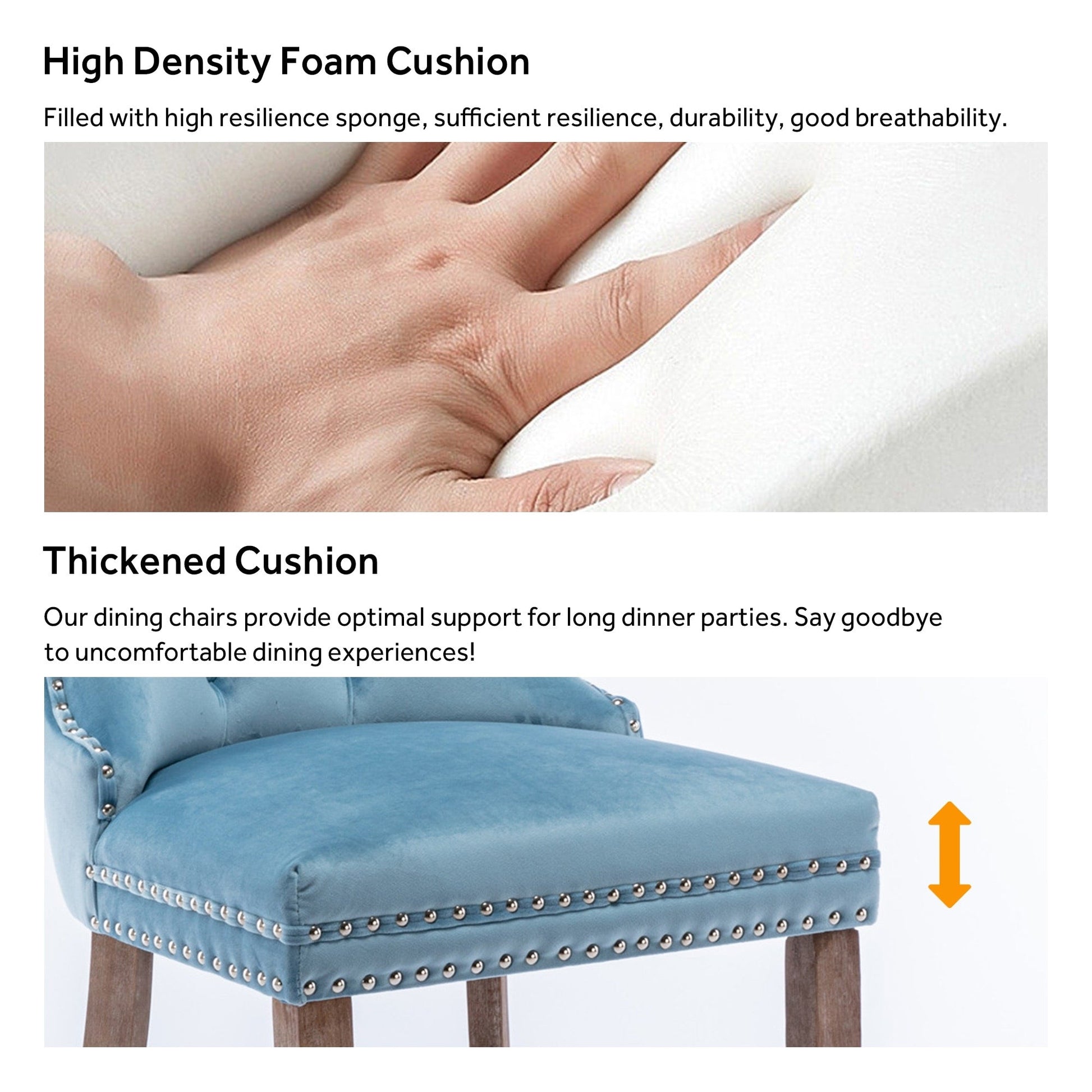 These wingback dining chairs are made of high-quality velvet fabric, which has super wear resistance and will not fade, the fabric is thick and luxurious, the touch is very delicate. This velvet dining chairs set featuring a very modern mid-century look. This dining chair set is equipped with high backrest for a strong comfortable back support. Plenty decorative rivet inset around cushion and back not only make it looks noble and elegant but also give the whole chair a feeling of exquisite luxury. We provide assembly instructions and assembly videos. If you have any questions, please contact us.