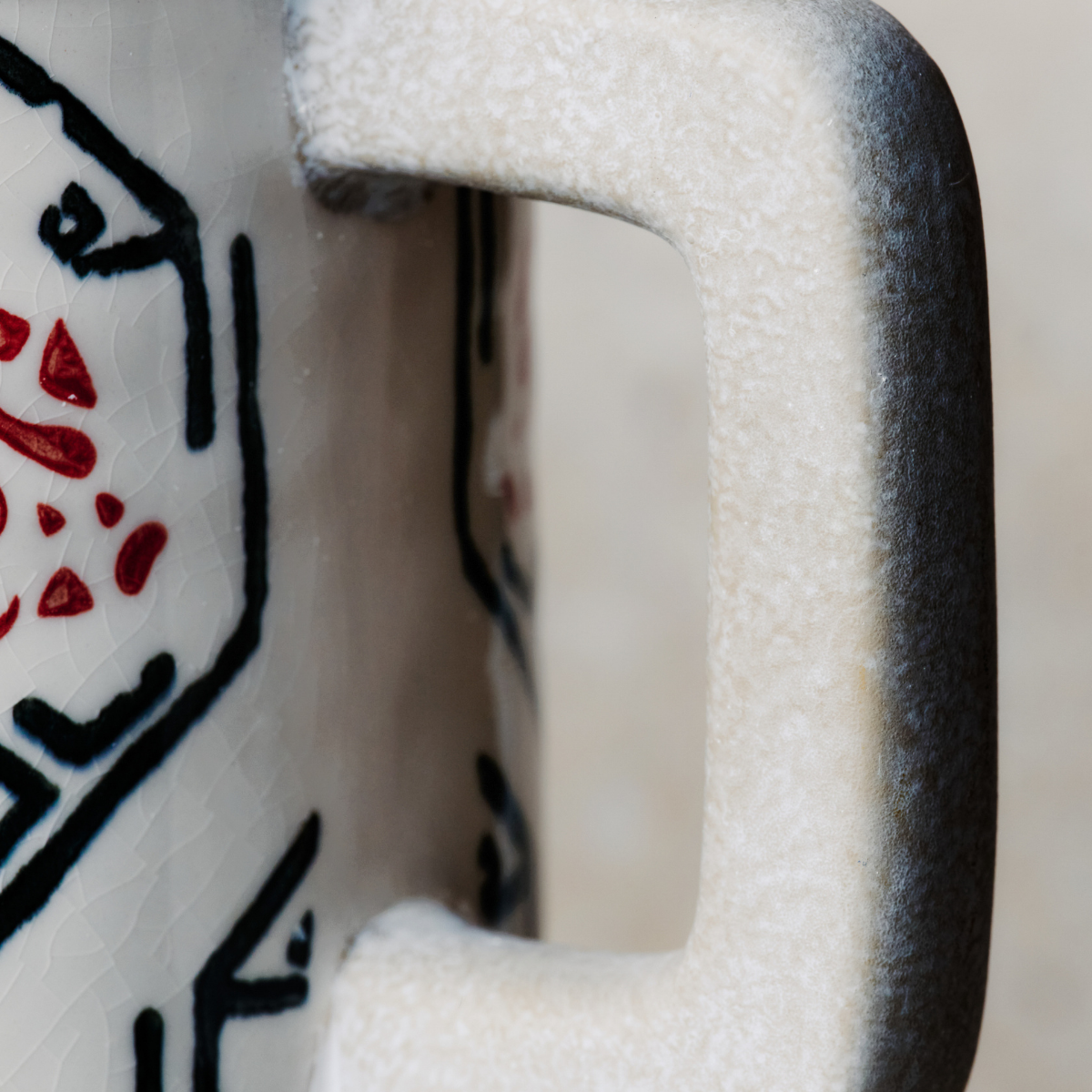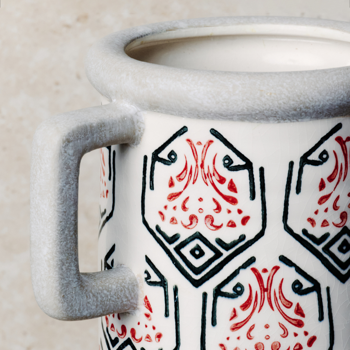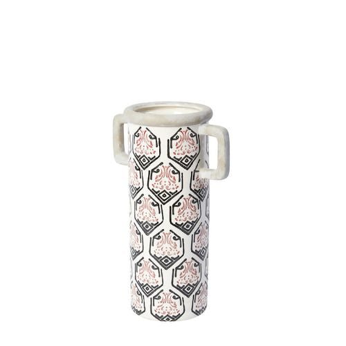 Vase AMARYLLIS avec poignées. Ce vase en céramique élégant au design géométrique saura mettre en valeur les jolies couleurs de vos bouquets ou compositions florales grâce à sa teinte sobre. Il s'accordera très bien avec les compositions blanches, noires et rouges. Il peut aussi être utilisé pour les fêtes de fin d'année avec des branches de baies rouges.
