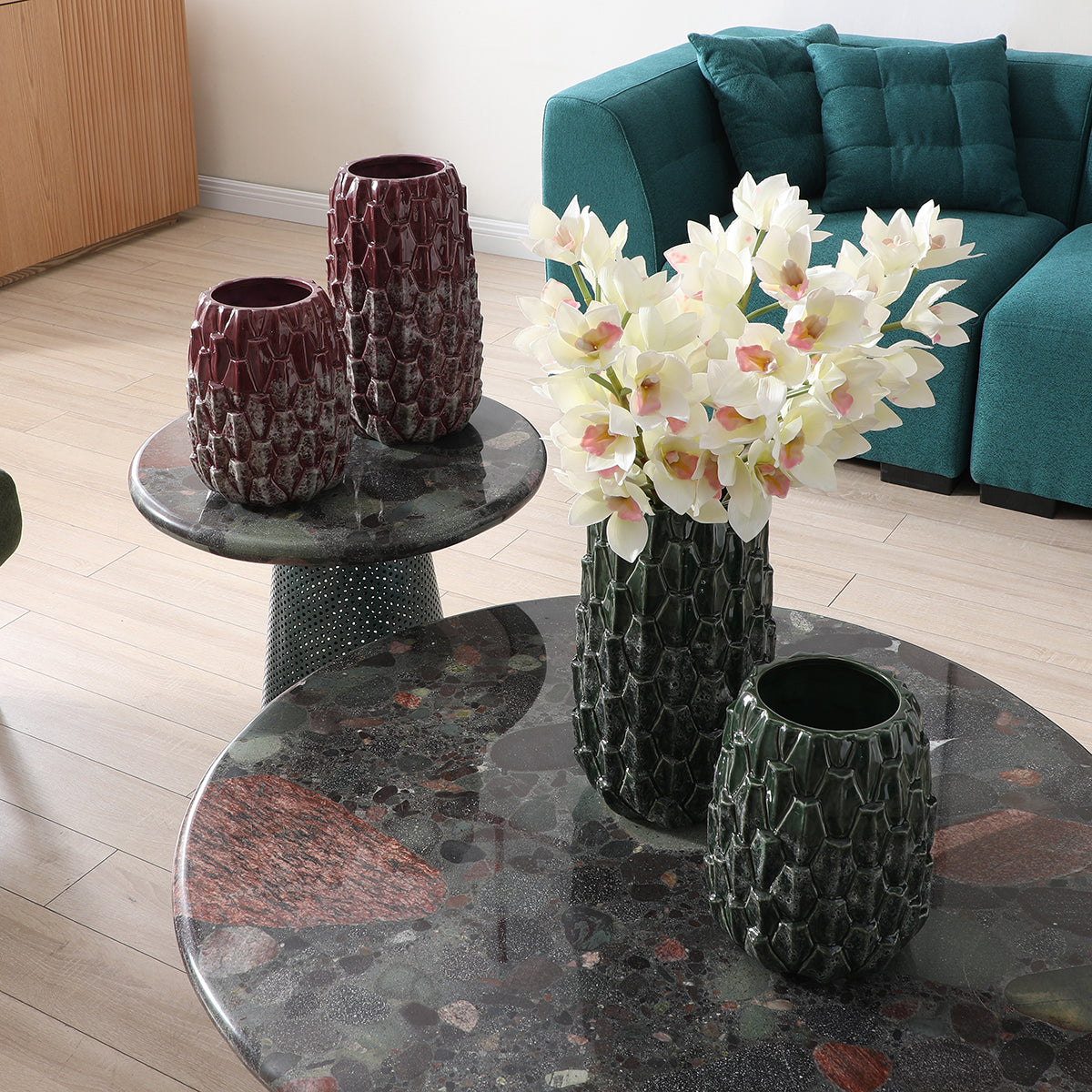 Vase en céramique avec un joli relief géométrique. Sa forme légèrement ovale évoque l'artichaut ou le chardon. Ce vase coloré, au col légèrement resserré et à l'effet dégradé en bas, est parfait pour accueillir des bouquets de taille moyenne ou des compositions de fleurs blanches afin de les mettre en valeur. Il leur assure un excellent maintien. Il peut être associé aux trois autres vases de la même collection pour créer un ensemble harmonieux de 4 vases et une jolie décoration intérieure à l'esprit naturel dans des tons verts et violet foncé.